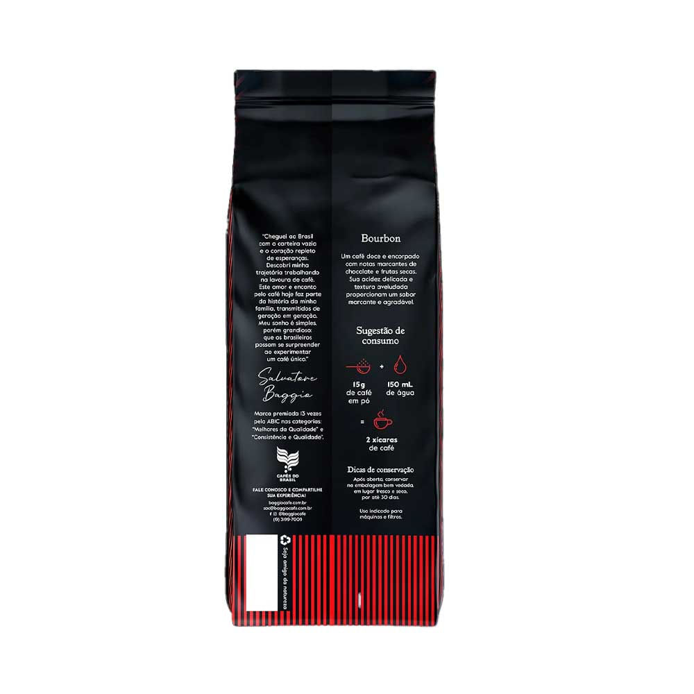 O Baggio Café Especial Bourbon é um café especial artesanal. Torrado artesanalmente, possui um paladar definido, com acidez sutil, ideal para apreciadores dessa variedade. Apresenta notas gustativas marcantes, corpo e doçura muito presentes.