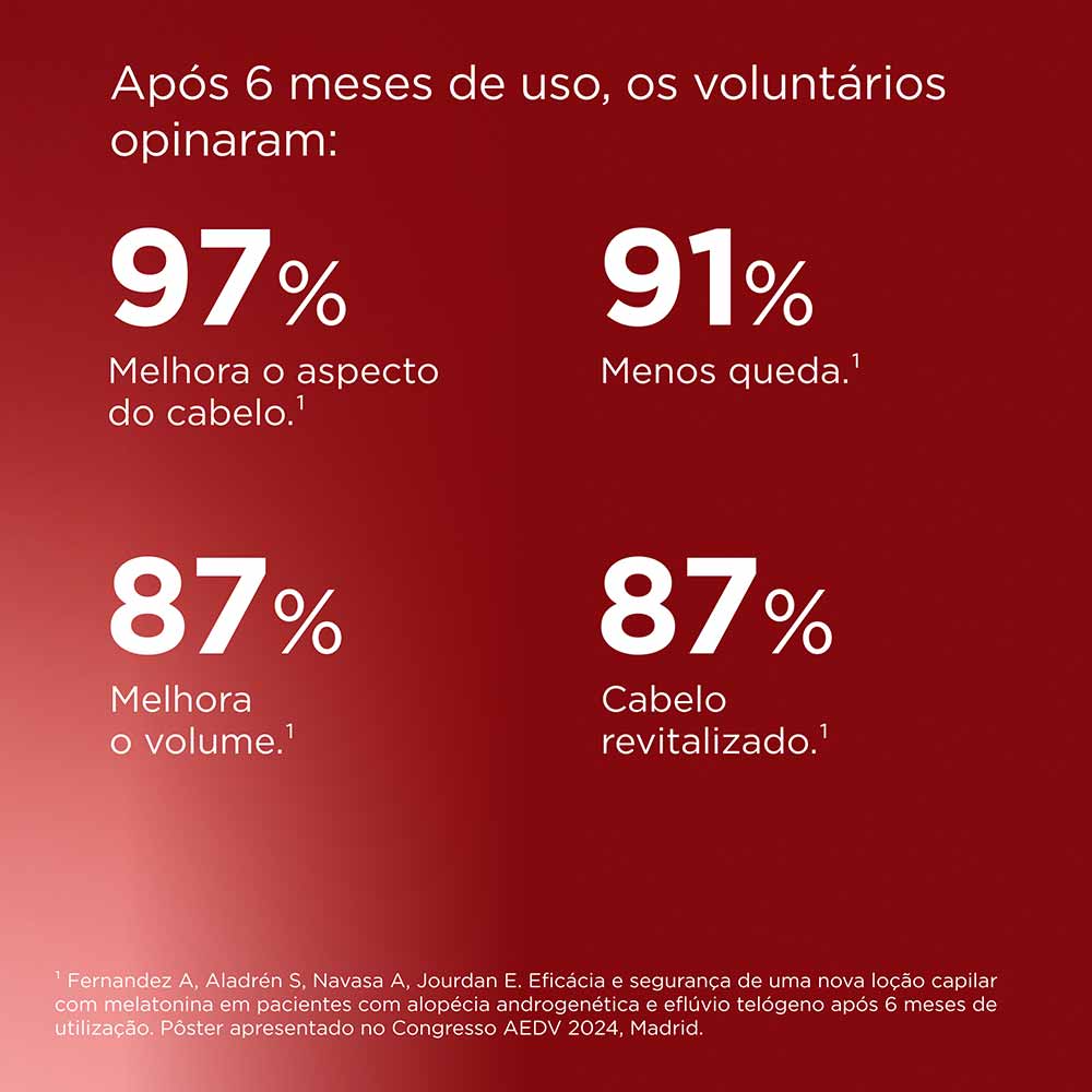 A loção estimula a fase de crescimento dos fios e possui melatonina, um potente antioxidante que combate os radicais livres.