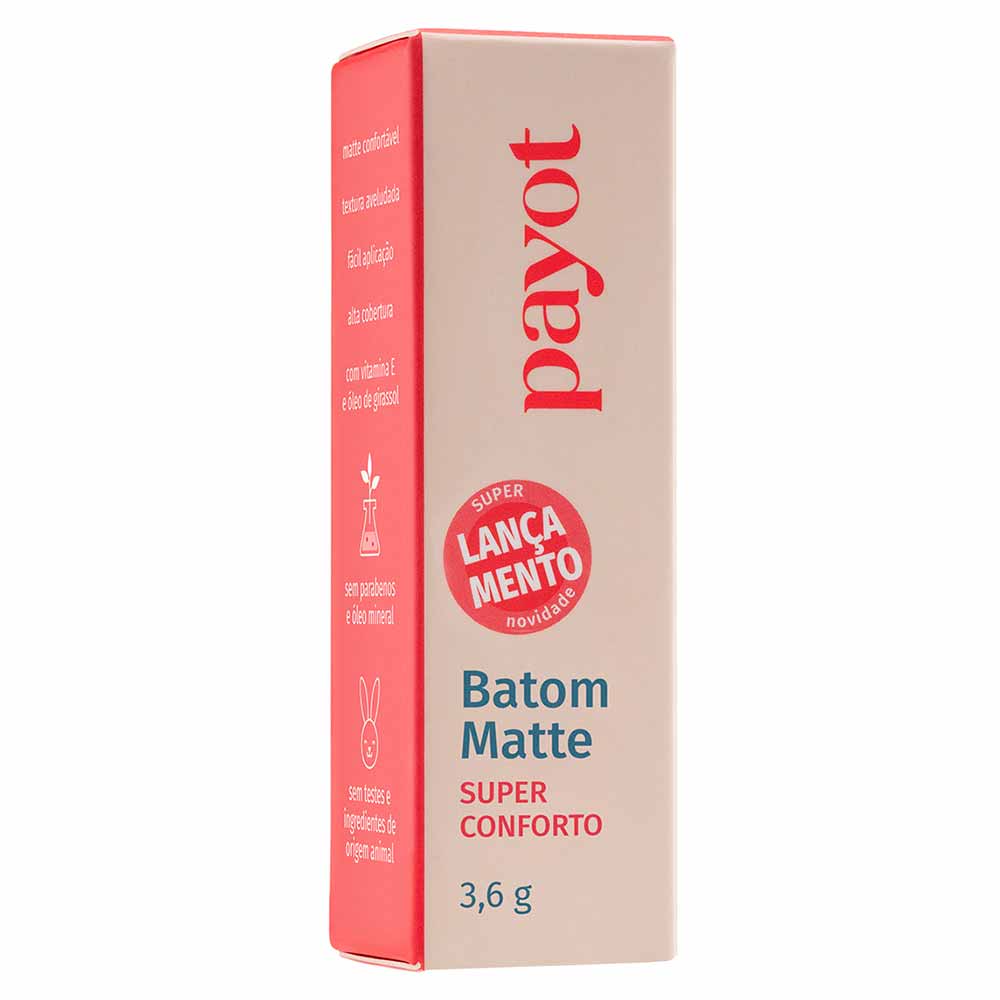 O Batom Matte Payot é um batom de acabamento matte com alta cobertura, projetado para conferir aos lábios uma cor intensa e duradoura.
