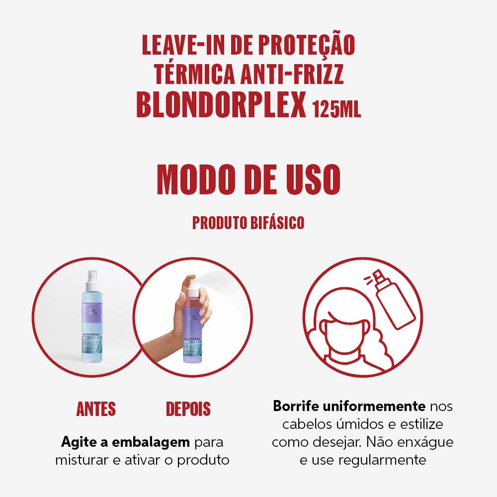 O Leave In de Proteção Antifrizz Wella Professionals BlondorPlex é um tratamento capilar inovador, especialmente formulado para atender às necessidades dos cabelos loiros, descoloridos e com mechas. Com uma ação bifásica poderosa, este leave-in cria uma barreira protetora invisível sobre os fios, garantindo proteção térmica até 220°C contra o calor do secador e chapinha, além de proteção UV contra os raios solares. Isso evita o ressecamento e danos severos enquanto mantém a saúde e brilho dos seus cabelos.