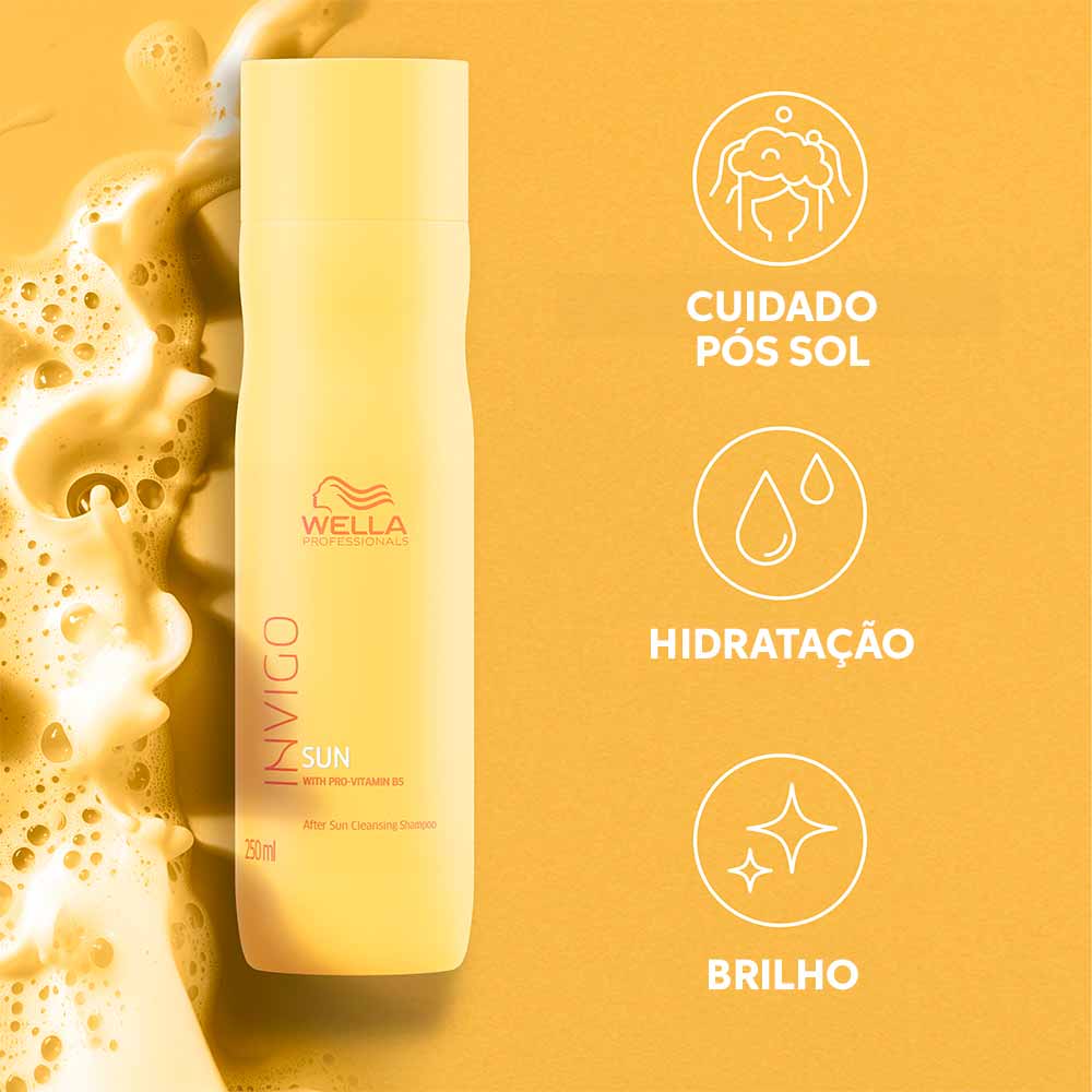 Você sabia que seus cabelos também precisam de proteção solar? Invigo Sun Shampoo Pós Sol de Wella Professionals proporciona uma limpeza profunda aos fios após a exposição a água do mar, areia e aos raios UV. A linha é indicada para a reconstrução e proteção dos fios contra raios UV, além de garantir a proteção da cor. Use antes, durante e depois da exposição ao sol. Os produtos de Invigo Sun possuem Vitamina E, que protege o cabelo dos danos causados pela exposição ao sol, e pró vitamina B5, que hidrata intensamente os fios após a exposição aos raios UV. A fragrância da linha Invigo Sun é um show à parte: os produtos contêm essência de flor de laranjeira, uma fragrância moderna, floral e frutada para um verão refrescante. A linha Wella Invigo fornece momentos revigorantes tanto em salões como na sua casa. Aproveite os produtos de tecnologia avançada, que possuem as melhores vitaminas e ingredientes para cuidar dos seus fios. Neste verão, cuide dos seus cabelos como você cuida da sua pele! Proteja seus fios com Invigo Sun, de Wella Professionals. Benefícios: Proteção da cor contra raios UV; Efeitos de reparação e hidratação. Indicação: Este produto é recomendado para todos os tipos de cabelo. Resultado: Seu cabelo fica hidratado, reparado e protegido dos danos pela exposição ao sol e mar. Precauções: Evite contato com os olhos. Mantenha fora do alcance de crianças. Evitar contato com os olhos. Caso isso aconteça, lavar imediatamente com água abundante. Modo de usar: Aplique o shampoo pelo cabelo úmido. Massageie gentilmente para fazer espuma. Em seguida, enxágue. Se necessário, repita o processo.