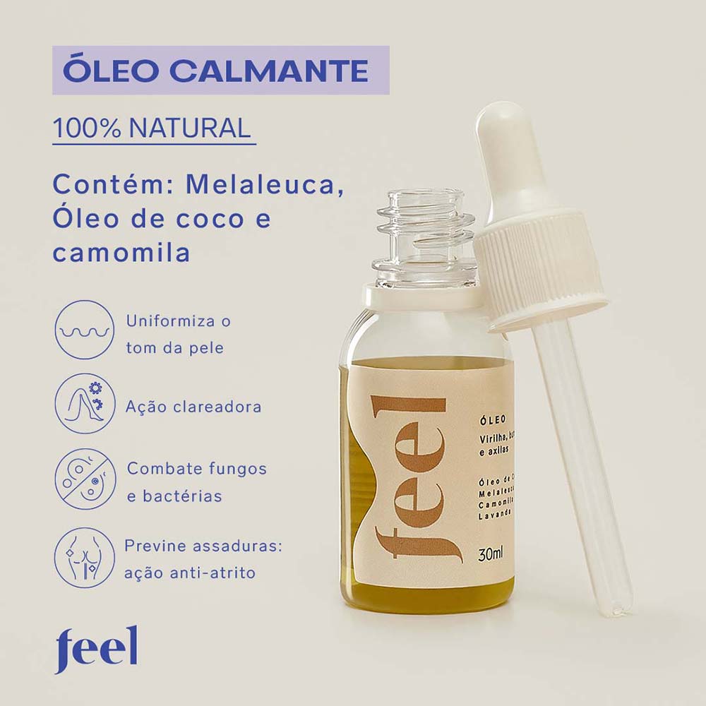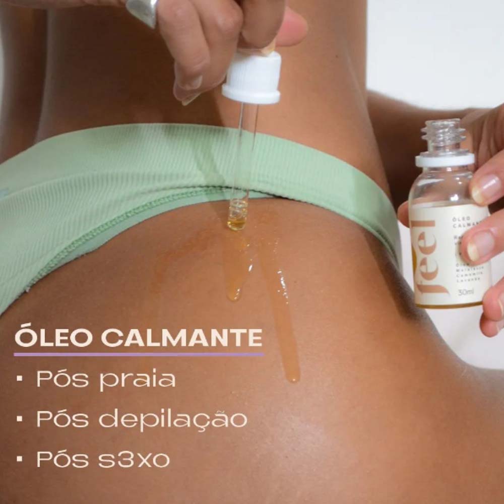 O Óleo Calmante Feel também é o auxiliar perfeito para suavizar os incômodos que podem ocorrer após a depilação, assaduras e prevenir aquelas bolinhas que surgem no bumbum, axilas e outras áreas.