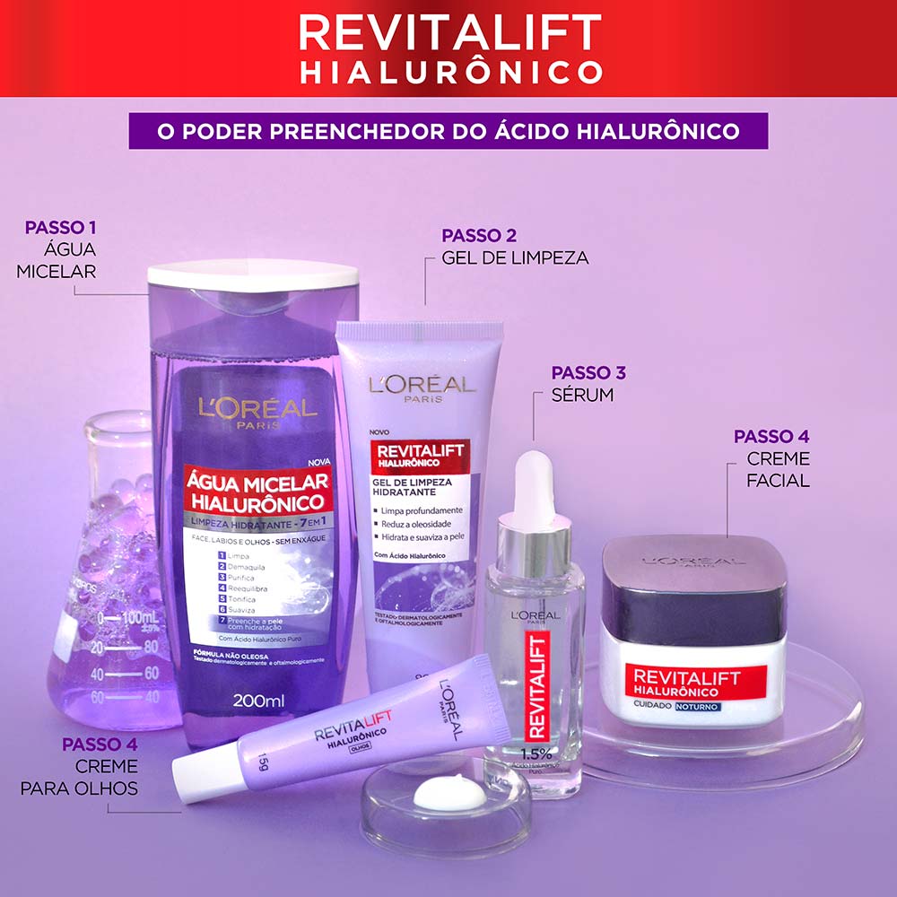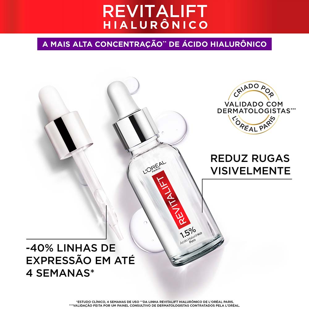 O novo Sérum Preenchedor Revitalift Hialurônico de L'Oréal Paris, é um sérum anti-idade com ação preenchedora. Sua fórmula possui uma rápida absorção, sem sensação oleosa e não obstrui os poros. Com 1,5% de ácido Hialurônico, hidrata a pele e reduz até 40% das linhas de expressão em até 4 semanas. Testado com dermatologistas, o novo Sérum Preenchedor Revitalift Hialurônico é indicado para todo tipo de pele e é adequado também para peles sensíveis. Ácido Hialurônico: o que é e como age na pele? É uma substância produzida naturalmente pelo organismo e presente na pele, mas a sua produção decai com o passar dos anos. Possui um alto poder preenchedor, capaz de manter até 1000 vezes o seu peso em água hidratando e preenchendo a pele, devolvendo a vitalidade e combatendo linhas de expressão. No Sérum Revitalift Hialurônico de L’Oréal Paris, ele está presente em duas versões: - MICRO ÁCIDO HIALURÔNICO: hidrata e preenche a superfície da pele - MACRO ÁCIDO HIALURÔNICO: penetra profundamente preenchendo rugas e linhas de expressão Resultados Visíveis: - Em uma semana*: a pele parece mais radiante, com sensação de preenchida e firme. - Em duas semanas**: redução das linhas de expressão (-19%) e redução de rugas (-14%). - Em 4 semanas**: redução das linhas de expressão (-40%) e redução de rugas (-31%). Modo de usar: Utilizar a cada manhã e/ou noite, aplicando 2-3 gotas no rosto e pescoço. Para melhores resultados, use o resto da gama Revitalift Hialurônico. Validação feita por um painel consultivo de dermatologistas contratados pela L'Oréal. *Estudos em consumidores com 55 mulheres **Estudo clínico em 53 mulheres por 4 semanas