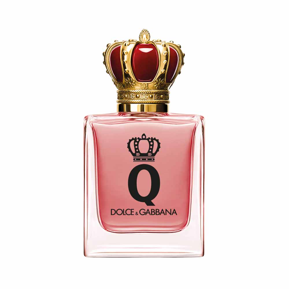 O encanto a partir do Frasco O frasco da nova fragrância ecoa o original Q by Dolce&Gabbana, tanto na tampa, que retrata uma coroa real em ouro e vermelho, quanto no vidro que contém a essência de um ousado tom de cereja.