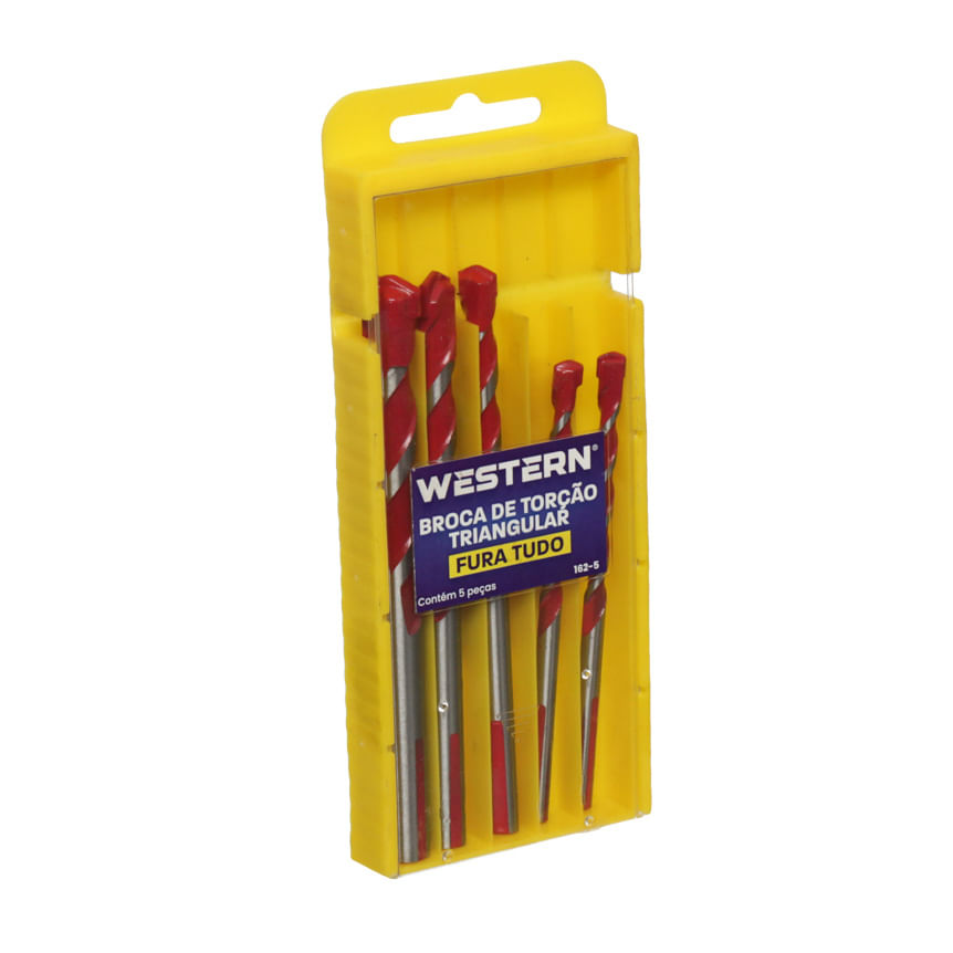 JOGO 5 BROCAS DE TORÇÃO TRIANGULAR FURA TUDO - Contém: • 2 Brocas 6mm • 1 Broca 8mm • 1 Broca 10mm • 1 Broca 12mm - Dimensões da Embalagem: 6,2 x 2 x 15,7cm (CxLxA) - Tipo de Embalagem: Estojo com Adesivo - Quantidade Inner: 12 Peças - Dimensões Inner: 17,5 x 6,5 x 7cm (CxLxA) - Quantidade Master: 48 Peças - Dimensões Master: 31 x 21 x 18cm (CxLxA) - Material: Aço Carbono - Cor: Preto e Vermelho - Marca: Western - Origem: China - Características: • Não queima a ponta facilmente, é ultra resistente. • Possui design inovador com tecnologia U-Slot, o que permite que a broca remova a sujeira para uma perfuração mais precisa. • Possui corpo triangular antiderrapante, portanto a broca fica firme na furadeira e não escorrega. • Pode ser usada em várias superfícies sem precisar trocar de brocas. - Perigos: • Cuidado durante o manuseio do produto para evitar acidentes. - Cuidados: • Utilize equipamento de proteção individual necessário ao trabalho (Óculos de proteção, botas, etc.). - Advertência/Atenção: • Manter fora do alcance das crianças. - Antes do uso: • Verificar se o produto está em perfeitas condições de uso. - Indicação: • Indicada para furar os materiais: mármore, madeira, ferro, vidro, concreto e porcelanato. - Sac Fornecedor: • Sac: 0800 607 1322 • Email: posvenda@etilux.com.br • Site: www.etilux.com.br - Garantia: • Em condições normais de uso, este produto tem garantia de 90 dias contra defeitos de material e fabricação, mediante apresentação da nota fiscal de compra. Má conservação, manuseio inadequado, quedas ou quaisquer outras avarias produzidas pelo uso incorreto, a garantia oferecida perde a validade.