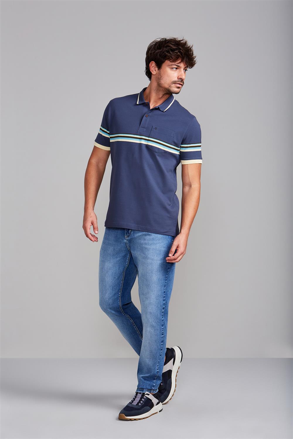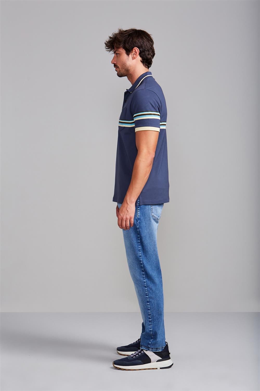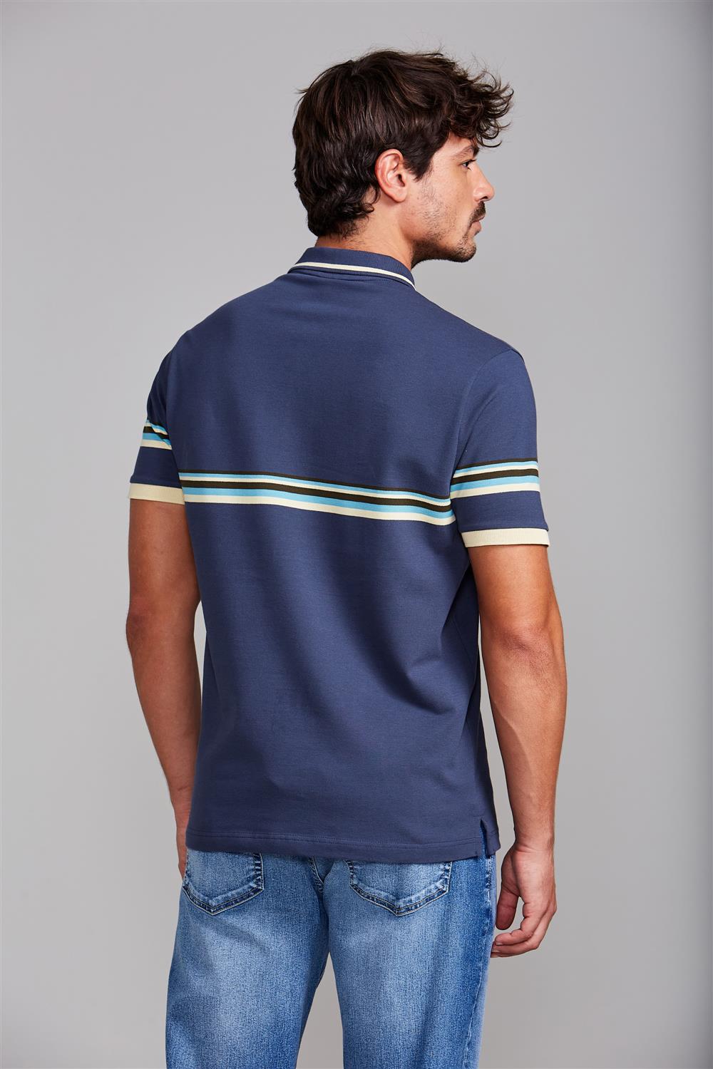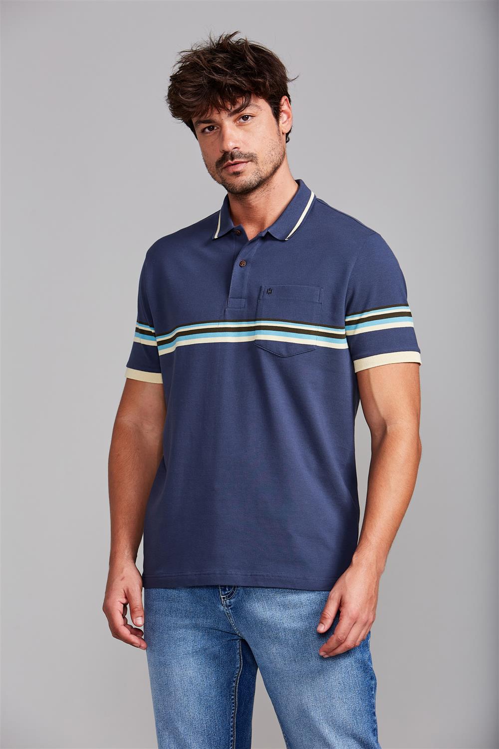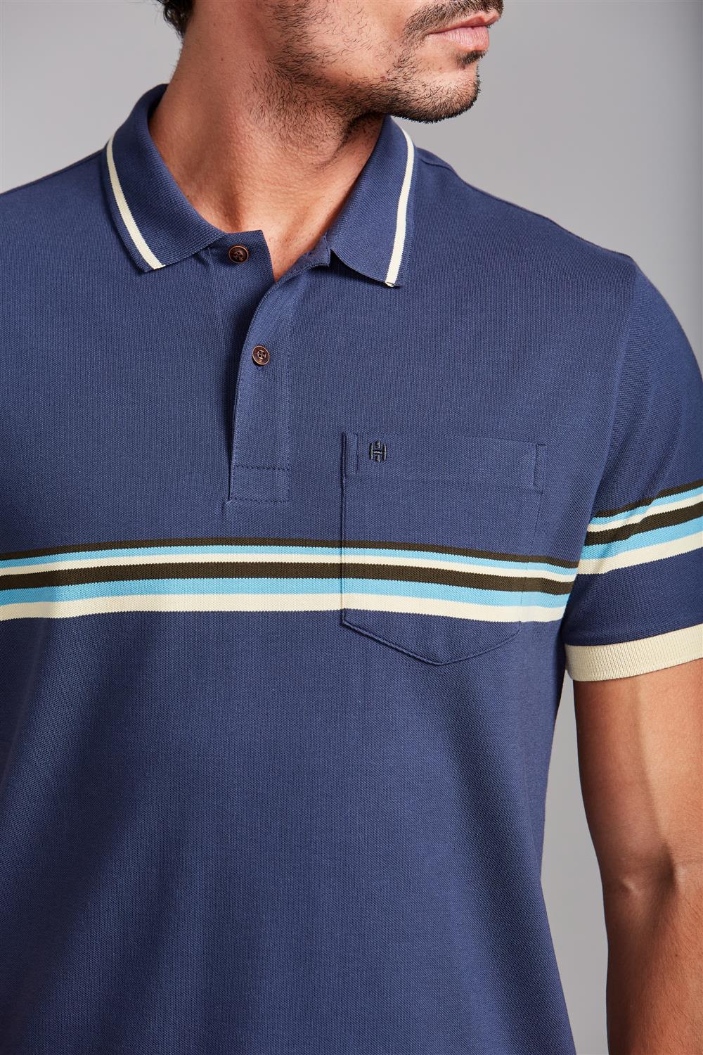Camisa Polo com Bolso Piquet Comfort - Azul Petróleo / Marrom Amêndoa
