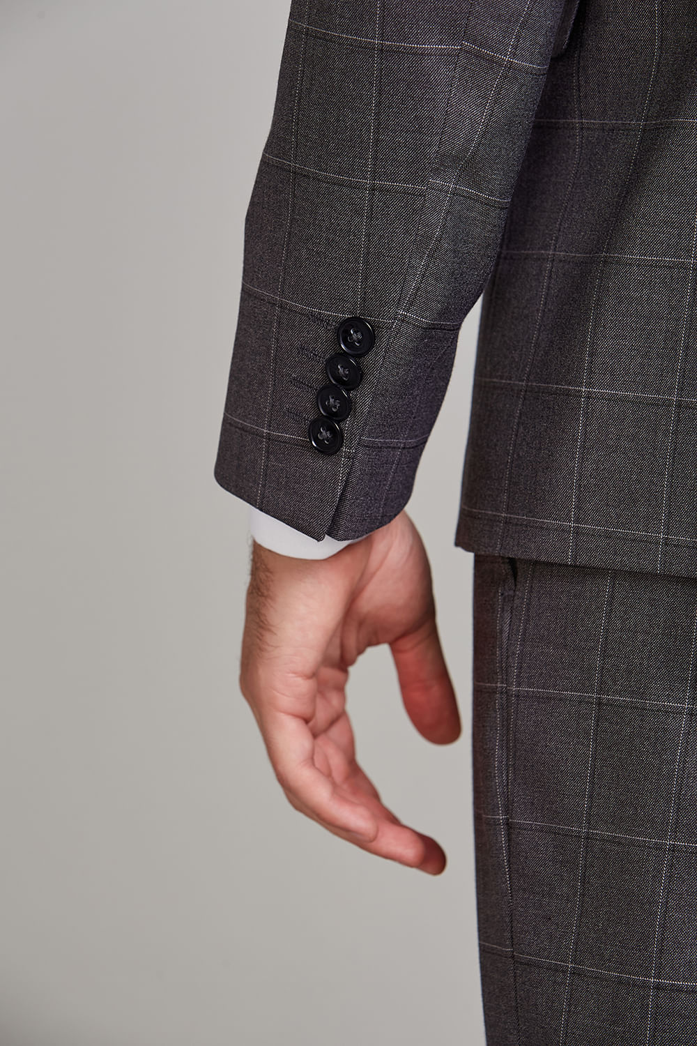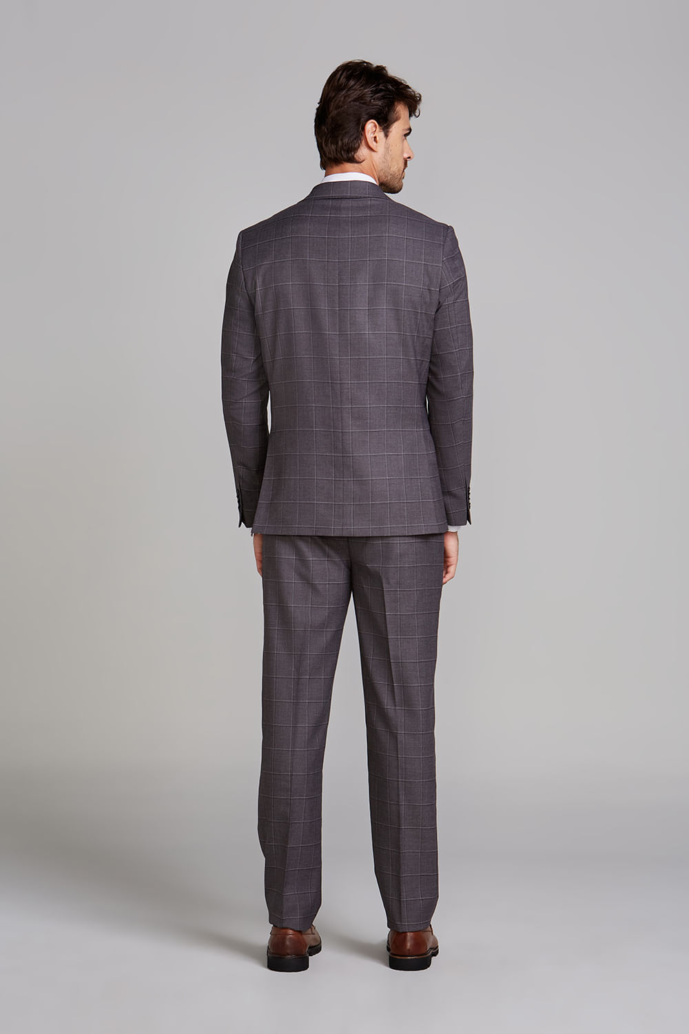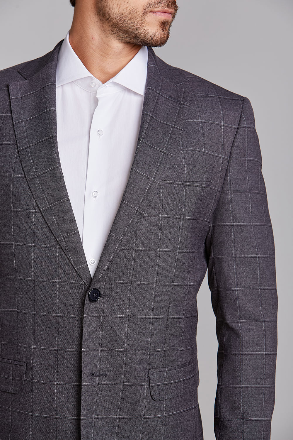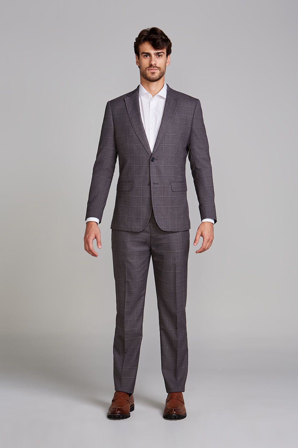 O Terno Xadrez é de Poliviscose e composto por 84% Poliéster, 14% Viscose e 2% Elastano. A Poliviscose é uma fibra sintética que têm a vantagem de ser mais resistentes e durável, além de estabilizar melhor a cor e o brilho. A peça conta com 2 cortes traseiros e 2 botões frontais. Este produto acompanha o paletó e a calça social.