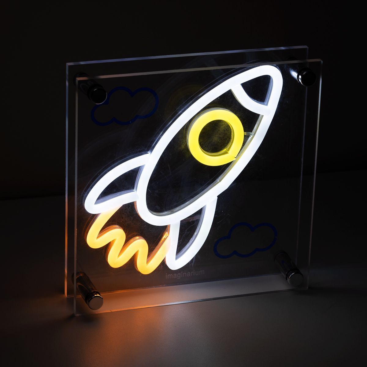 Apostando em um design fun que mescla estilo com uma boa dose de modernidade, essa belezinha conta com um formato de placa e traz luzes de LED que formam um foguete em seu interior.