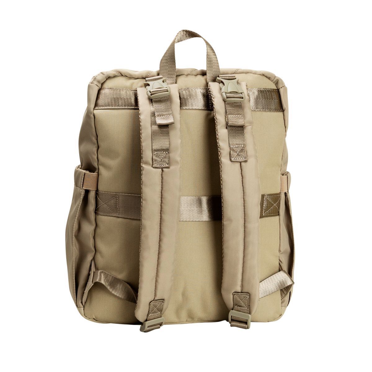 2 bolsos laterais (sendo um deles, ideal para colocar um pacote de lenços umedecidos, já que conta com uma segunda abertura frontal);