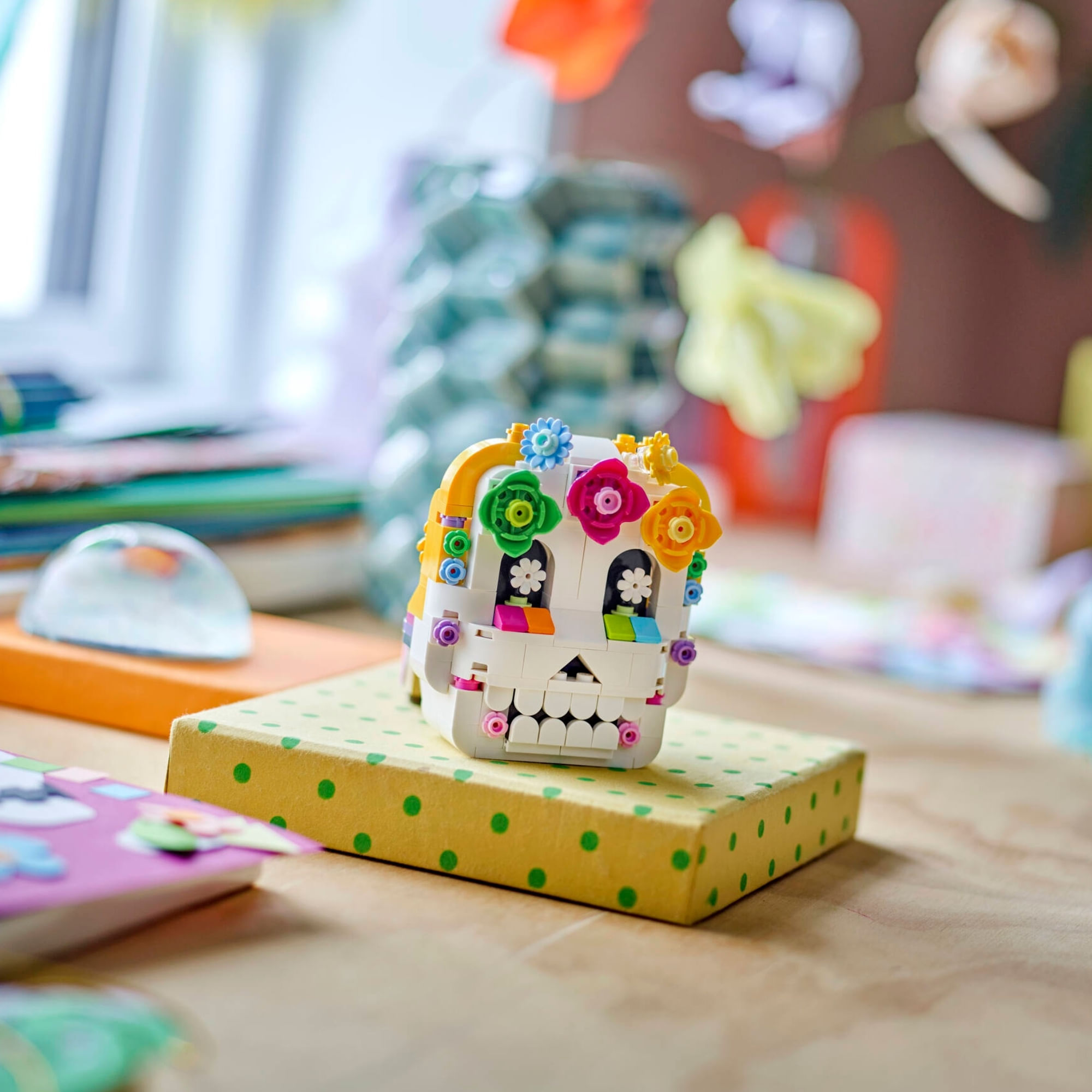 2 lados – Um lado do modelo apresenta uma caveira decorada com flores LEGO®, enquanto o outro apresenta um altar com um arco de flores e vários acessórios de comida