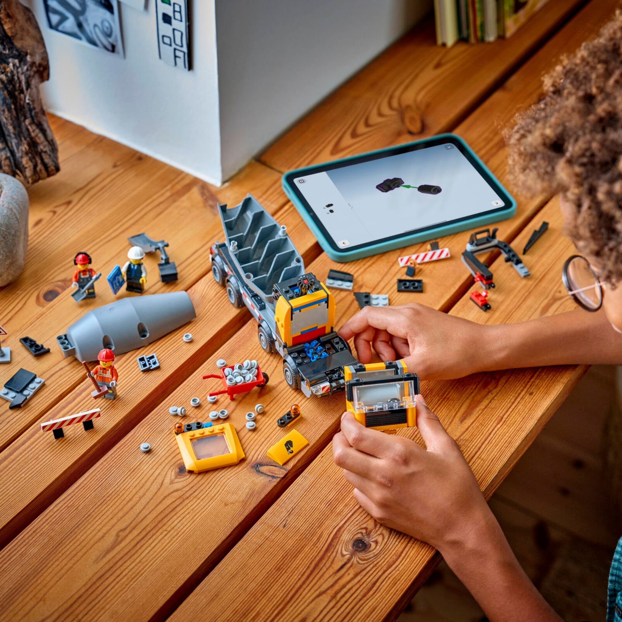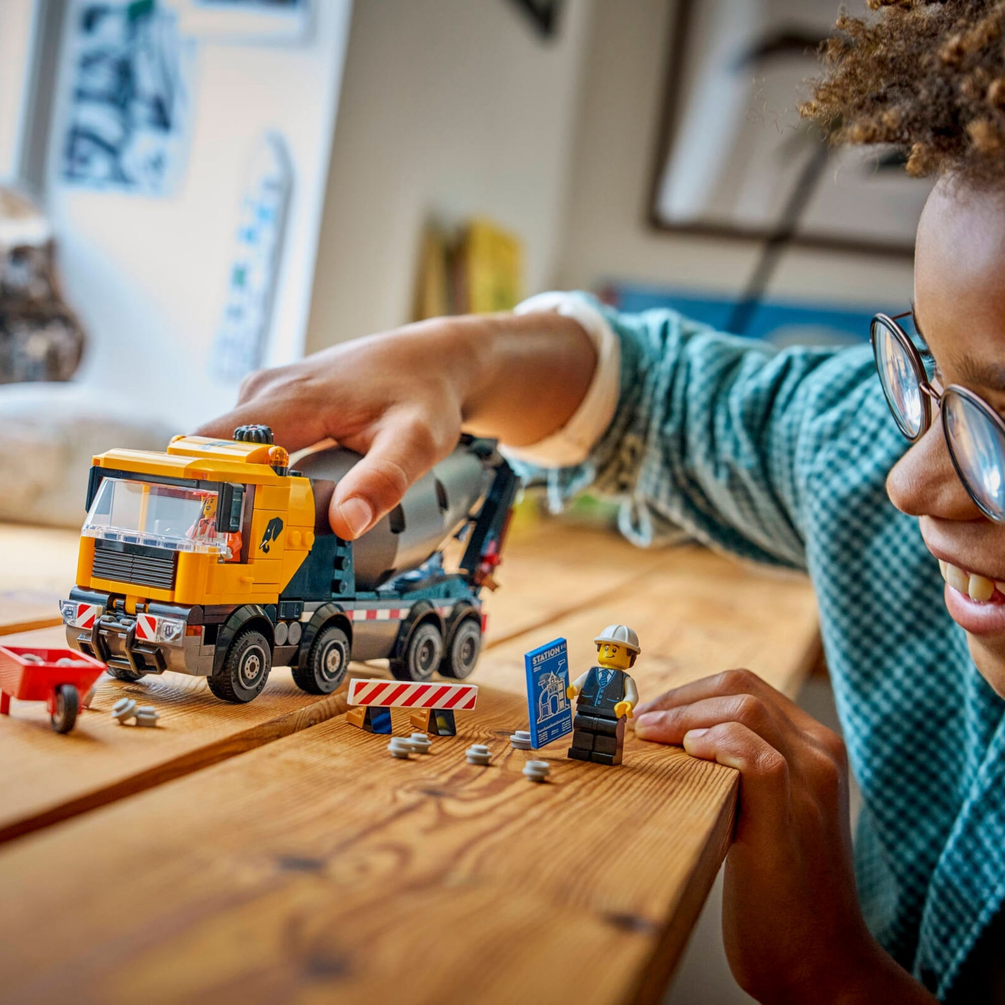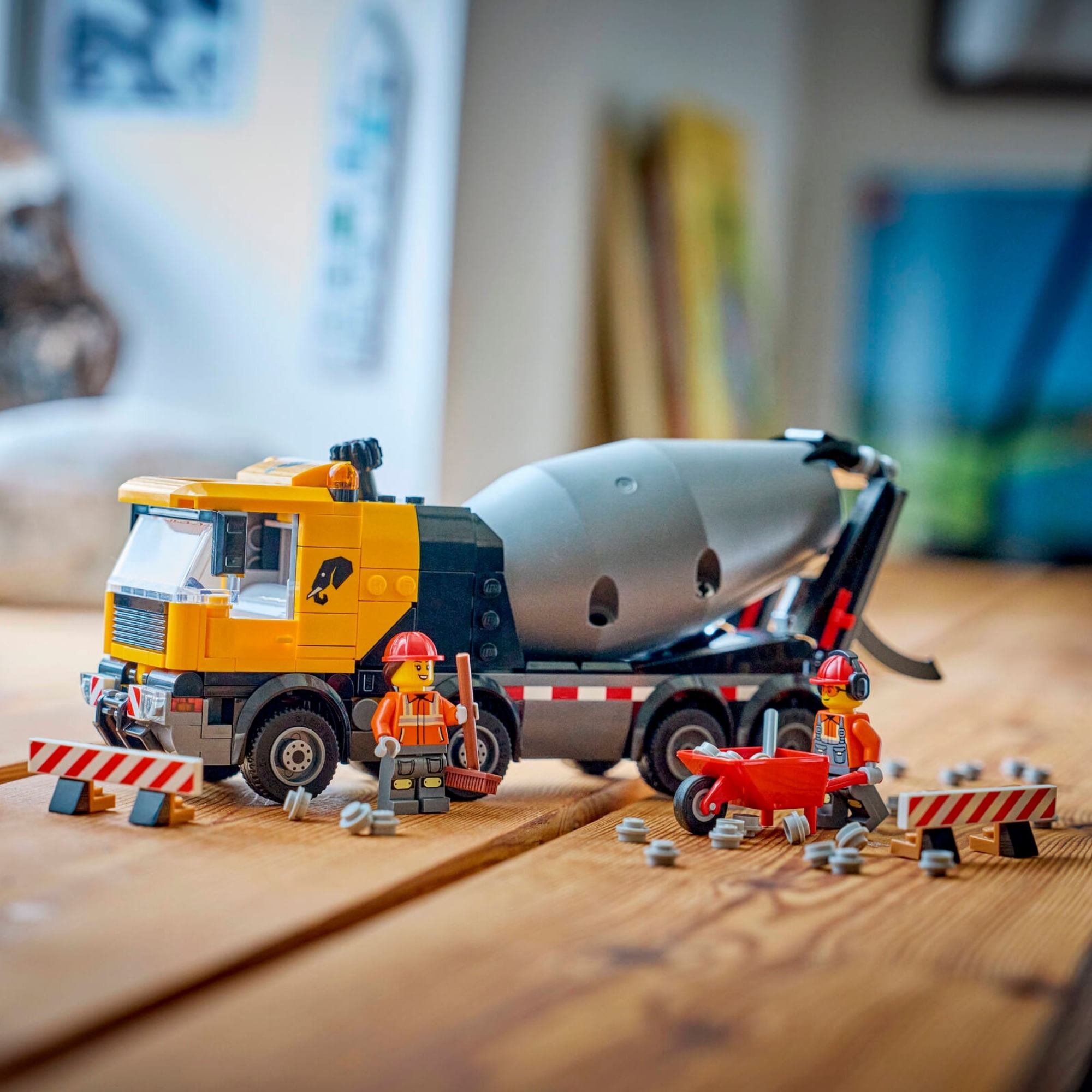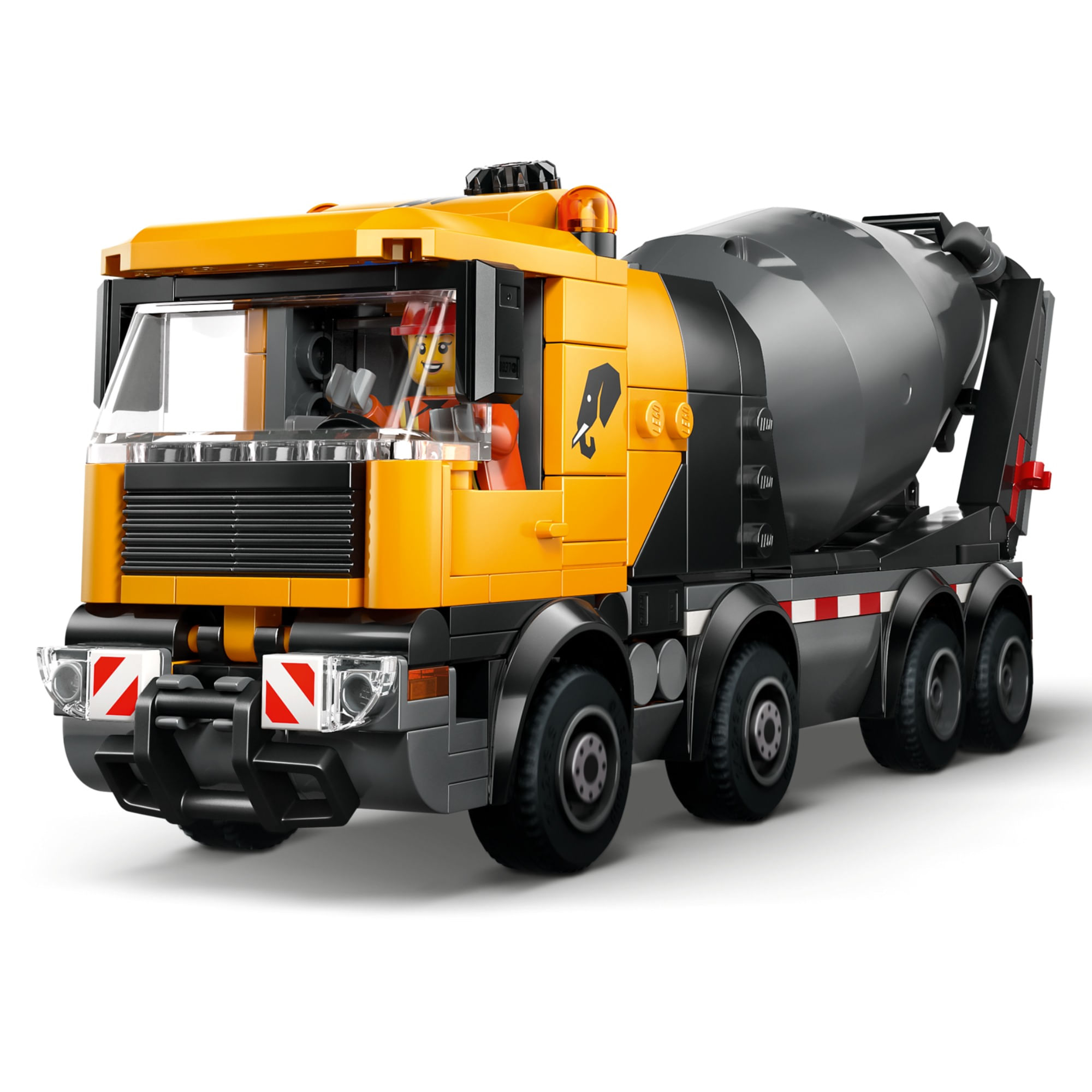 ACESSÓRIOS PARA MINIFIGURAS LEGO® – Este modelo de caminhão de cimento vem com acessórios LEGO, incluindo um carrinho de mão, placa de sinalização, 2 barreiras, uma prancheta, pá e vassoura.