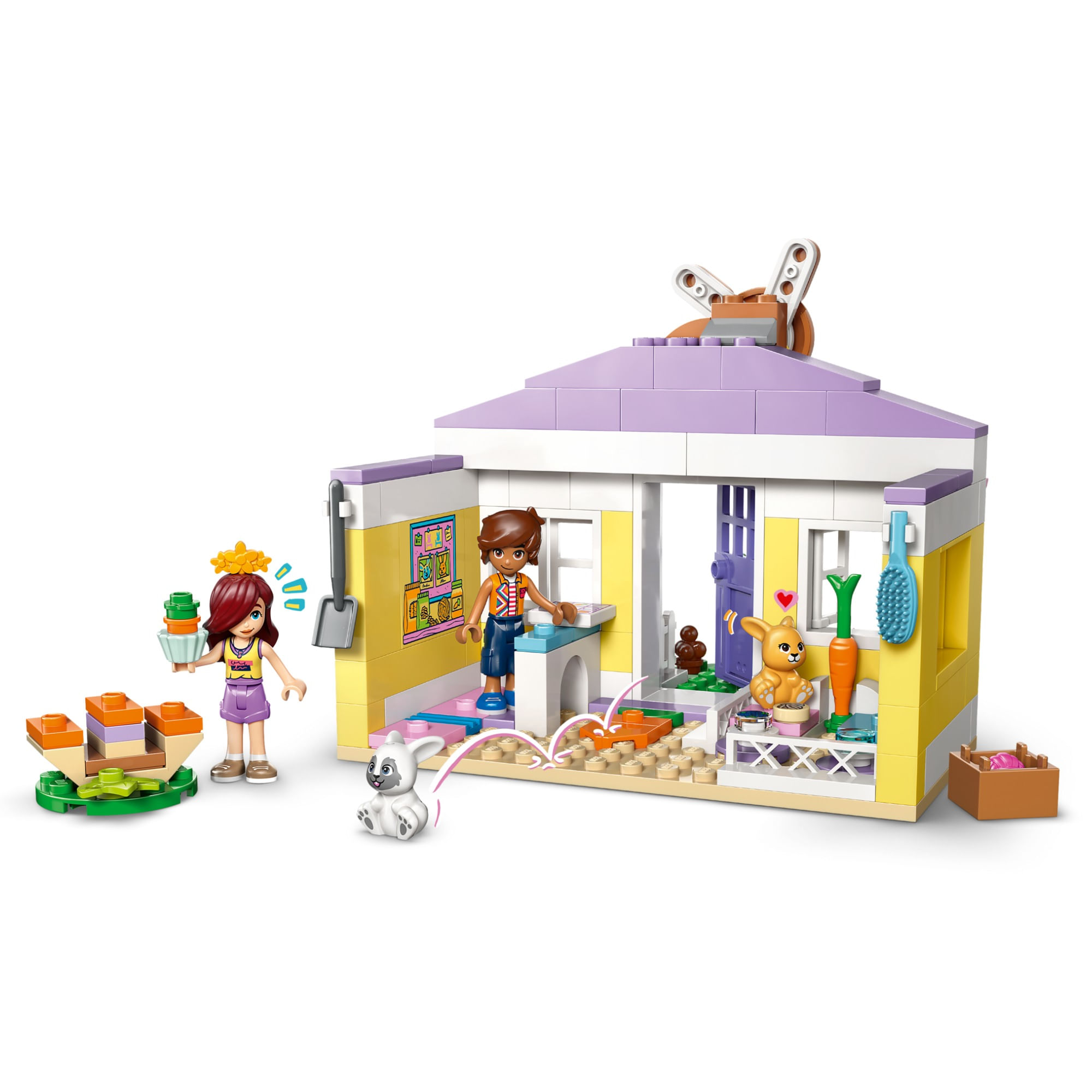 Entre na brincadeira de contar histórias com o Hotel dos Coelhinhos de Heartlake City LEGO® Friends (42679), um brinquedo para meninas e meninos a partir de 5 anos. Este brinquedo de faz-de-conta inclui 2 minibonecas e 2 coelhinhos de brinquedo, permitindo que as crianças criem histórias sobre cuidados com animais. Este adorável conjunto está repleto de detalhes divertidos, como a portinha especial para os coelhinhos e a plaquinha fofa com o coelhinho. Dentro, há um tapete em formato de cenoura, uma área para dormir com caminhas para os coelhinhos e uma lista de verificação para registrar a entrada e saída deles do hotel. Do lado de fora, há uma área de estar para os coelhinhos, onde eles podem sentar juntos e saborear um cupcake de cenoura. Outros acessórios incentivam as crianças a cuidar dos bichinhos, como uma escova, um novelo de lã, comida e água para os coelhinhos e uma pá para recolher as fezes. Este conjunto é um ótimo presente para meninas e meninos que amam animais. Com o aplicativo LEGO Builder, as crianças podem desfrutar de uma aventura de construção intuitiva, onde podem ampliar e girar os conjuntos usando instruções de construção em 3D, salvar conjuntos e acompanhar o progresso. O conjunto contém 161 peças.