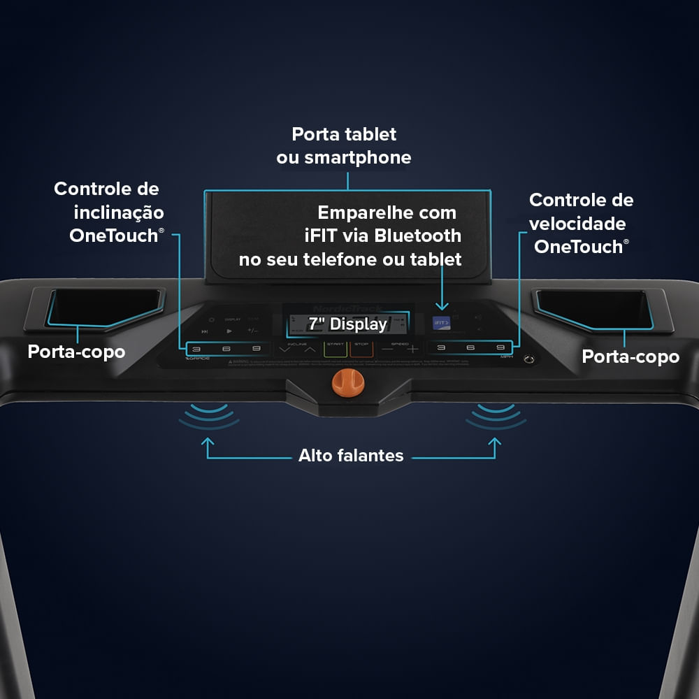 E o melhor: compre a sua esteira e ganhe 30 dias de assinatura do app iFIT, a plataforma fitness líder nos Estados Unidos. Com o iFIT, você conecta a Nordictrack T5 e faz rotas de treinos por todo o mundo, acompanhado por um personal trainer durante o percurso. Integração completa A esteira Nordictrack T5 tem suporte para tablet ou smartphone e é compatível com o SmartAdjust™ e o monitoramento detalhado ActivePulse™, ambas funções integradas ao iFIT.