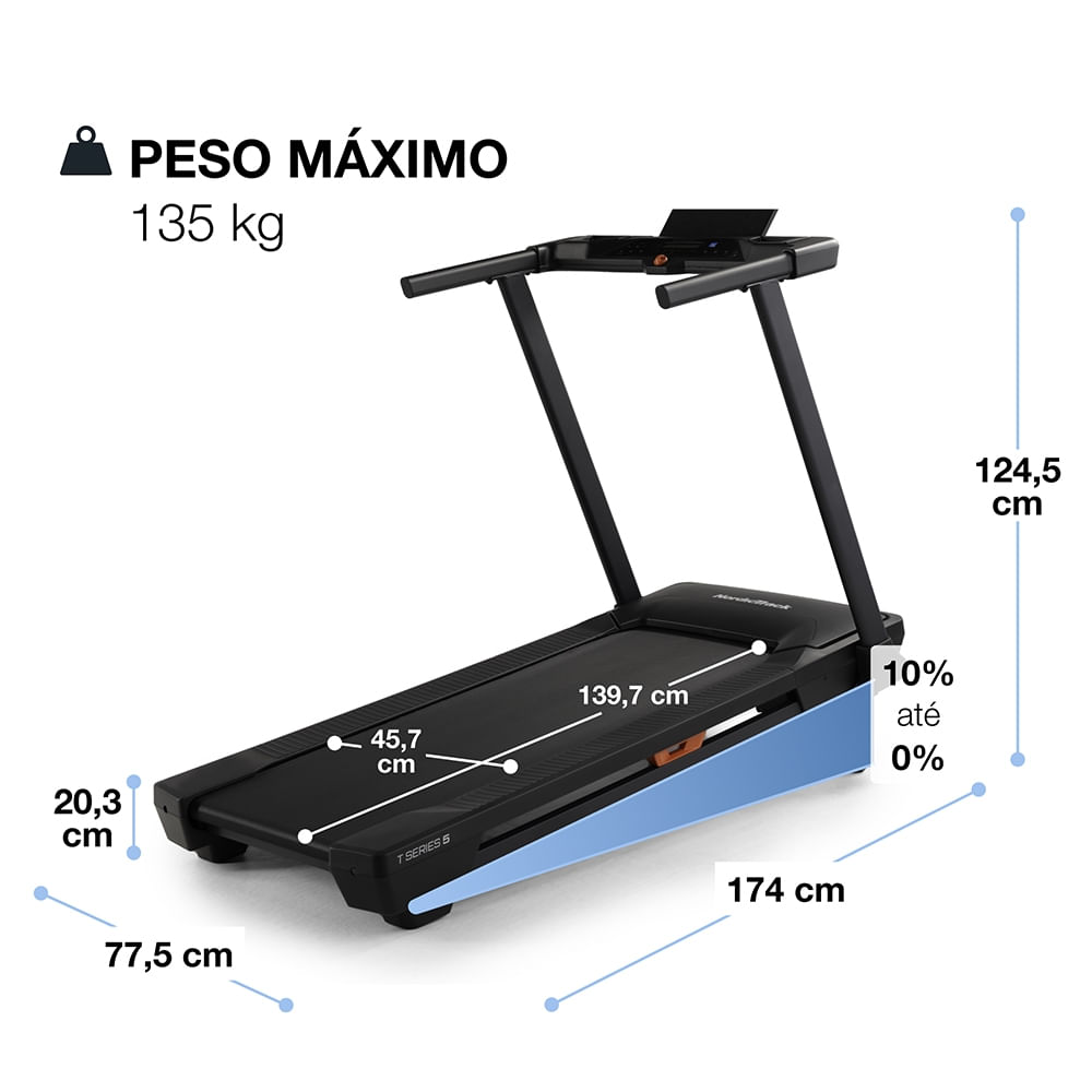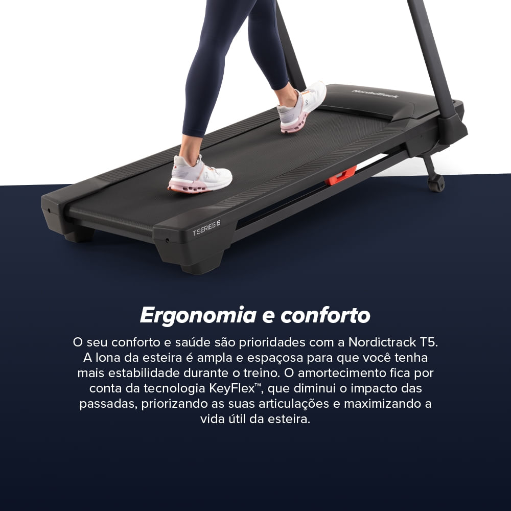 No seu pique! A Nordictrack T5 tem potência de sobra para acompanhar o ritmo do seu treino. Com um motor de 2.6 CHP, ela mantém inclinação e velocidade constantes pelo tempo que você quiser. Ergonomia e conforto O seu conforto e saúde são prioridades. A lona da esteira é ampla e espaçosa para que você tenha mais estabilidade durante o treino. O amortecimento fica por conta da tecnologia KeyFlex™, que diminui o impacto das passadas, priorizando as suas articulações e maximizando a vida útil da esteira. Praticidade para a sua rotina Acompanhe com facilidade todas as informações importantes, como tempo, distância, calorias e muito mais durante o seu exercício pelo display de LCD integrado à esteira.