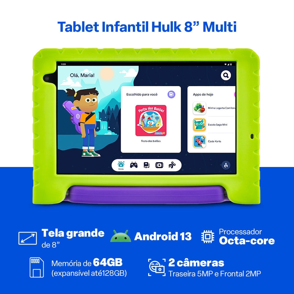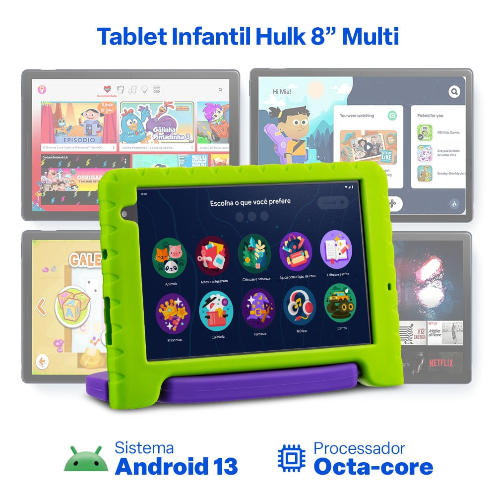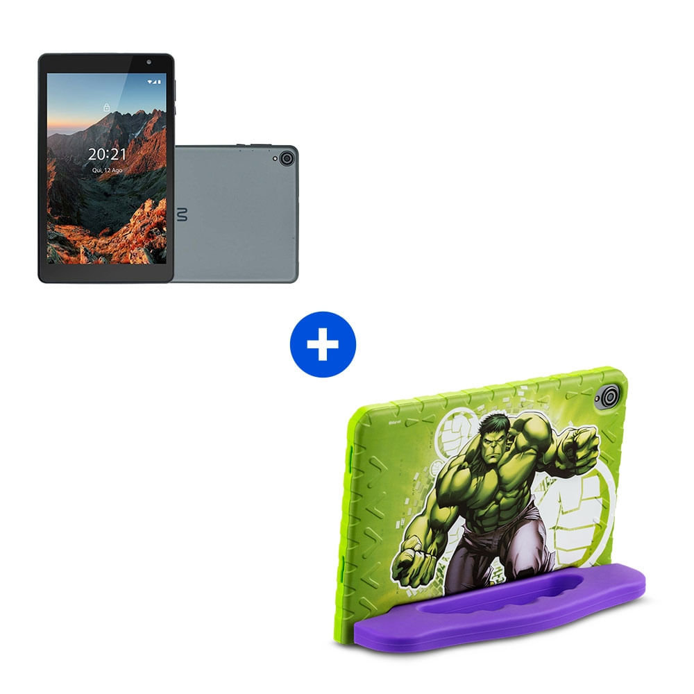 Com tela de 8 polegadas, o Tablet Hulk oferece imagens nítidas e cores vibrantes, perfeitas para assistir vídeos, jogar, estudar e explorar novos aprendizados.
