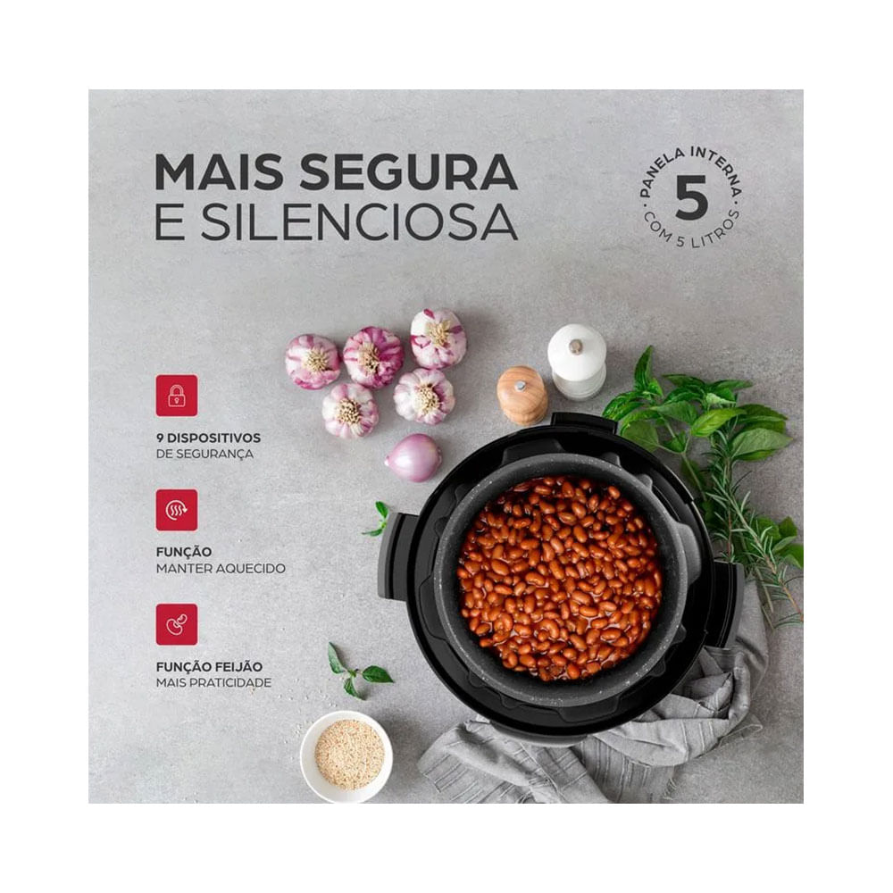 Panela de Pressão Elétrica WPPE2 - Wap Refeições seguras, práticas e saborosas para a família toda! Mais segura e eficiente comparada às opções tradicionais, a Panela de Pressão Elétrica WAP 5L Prosdócimo oferece tudo o que suas aventuras na cozinha precisam: economia, praticidade e confiança. Equipada com nove dispositivos de segurança, os sensores, válvulas, travas automáticas e manuais visíveis, oferecem controle total durante todo o processo de cozimento. Isso significa dar vida a refeições deliciosas de forma simples e segura, sem se preocupar com mais nada além do sabor. Imagine saborear vegetais, sopas, refogar temperos e alimentos rapidamente, tudo no ponto ideal. Com o timer de 90 minutos e aviso sonoro isso é possível! A panela de pressão elétrica 5L WAP permite criar uma variedade de pratos, ajustando o tempo de preparo de forma precisa para cada receita. Ao selecionar a “Função Feijão”, a cocção dos grãos é feita em menos tempo do que os métodos tradicionais, sem nunca perder o sabor. E, ao final do preparo, o desligamento automático ativa a "Função Manter Aquecido". Ela garante que os pratos permaneçam na temperatura ideal até a hora de servir. A capacidade interna de 5 litros da Panela de Pressão Elétrica é perfeita para preparar porções para a família toda. Seu recipiente interno removível é revestido com dupla camada antiaderente Gray Stone, o que evita que o alimento grude no fundo da panela, facilitando a limpeza. O design sofisticado em aço inox escovado da panela é moderno e combina com a sua rotina na cozinha. Além disso, ela é silenciosa, promovendo bem-estar durante o preparo das receitas. Equipada com acessórios úteis, a experiência culinária é completa. Prepare o feijão mais suculento e saboroso como um verdadeiro chef de cozinha com a melhor e mais segura aliada das receitas: a Panela de Pressão Elétrica WAP 5L Prosdócimo. - Potência: 900W - Pressão de trabalho: 70 kPa Frequência: 60 Hz Capacidade: 5 L Comprimento do cabo elétrico: 1 m Timer: 0-90 min Pés: Antiderrapante Aviso sonoro Desligamento automático Material: Polímeros e Metais Painel: Analógico/Mecânico Função Manter Aquecido Tipo de tomada: 10ª Acessórios: 01 Colher plástica 01 Copo medidor 01 Cabo elétrico 01 Cesto removível 01 Coletor Vapor Voltagem: 110V ou 220V Cor: Inox e Preto Peso líquido: 4 kg Dimensões do produto (C x L x A): 33,5 x 34 x 32 cm Fabricante: Wap