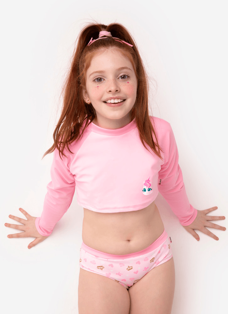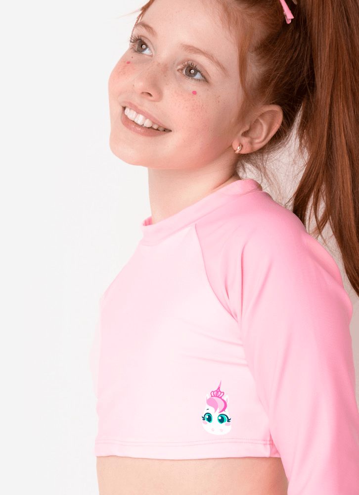 Conjunto com cropped. Possui estampa localizada e estampa rotativa com glitter. Nome do Produto: Cropped teen Unicórnio; Modelagem : Cropped com manga longa raglan Estampa: rotativa com glitter silk print localizado - cor da peça: rosa Tecido externo: 85% poliamida e 15% elastano Tecido interno: 88% poliamida e 12% elastano Ocasião de uso: Ideal para usar em clubes, academias, piscinas, praia Diferencial do produto: estampa localizada, tecido com toque macio; forro em poliamida de alta qualidade; altamente resistente ao cloro; proteção solar UV (não substitui o uso de filtro solar); conforto; Como lavar e conservar bem meu produto: lavagem à mão, temperatura máxima de 40c; não alvejar / não branquear; não secar em tambor; secagem em varal; não passar; não limpar a seco, não remover manchas com solventes; não guarde a peça úmida ; não use amaciantes ou produtos com alvejantes a base de cloro; evite contato com superfícies ásperas ; cloro e bronzeadores podem manchar o produto; após o uso, enxague bem a peça com agua fria; a contínua exposição à luz forte e água clorada pode deteriorar alguns tipos de tecidos e cores. Garantia por defeito: deverá ser encaminhado dentro da embalagem original; Sem indícios de uso; acompanhado de nota fiscal e com todos os itens constantes na solicitação de troca