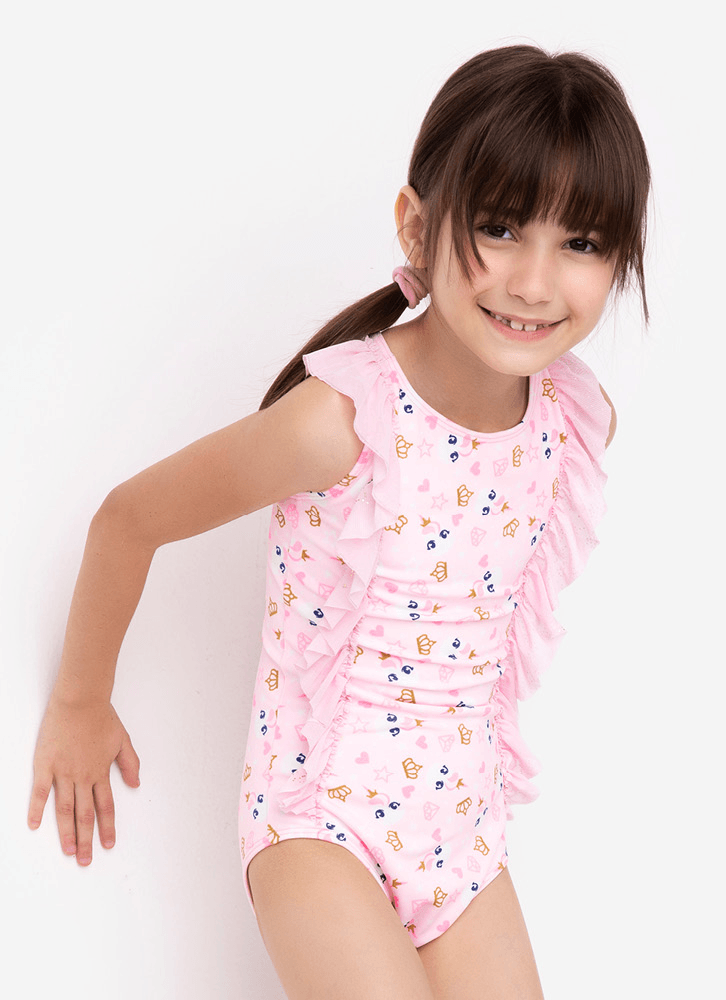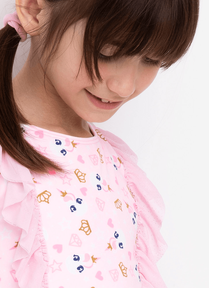 Maiô kids. Possui estampa rotativa de unicórnio com glitter e aplique de babados em tule. Nome do Produto: Maiô kids Unicórnio; Modelagem: alça com cruzamento nas costas; Estampa: rotativa com glitter - unicórnio cor da peça: rosa Tecido externo: 85% poliamida e 15% elastano Tecido interno: 88% poliamida e 12% elastano Ocasião de uso: Ideal para usar em clubes, academias, piscinas, praia Diferencial do produto: aplique de tule; tecido com toque macio; forro em poliamida de alta qualidade; altamente resistente ao cloro; proteção solar UV (não substitui o uso de filtro solar); conforto; estampa com glitter Como lavar e conservar bem meu produto: lavagem à mão, temperatura máxima de 40c; não alvejar / não branquear; não secar em tambor; secagem em varal; não passar; não limpar a seco, não remover manchas com solventes; não guarde a peça úmida ; não use amaciantes ou produtos com alvejantes a base de cloro; evite contato com superfícies ásperas ; cloro e bronzeadores podem manchar o produto; após o uso, enxague bem a peça com agua fria; a contínua exposição à luz forte e água clorada pode deteriorar alguns tipos de tecidos e cores. Garantia por defeito: deverá ser encaminhado dentro da embalagem original; Sem indícios de uso; acompanhado de nota fiscal e com todos os itens constantes na solicitação de troca.