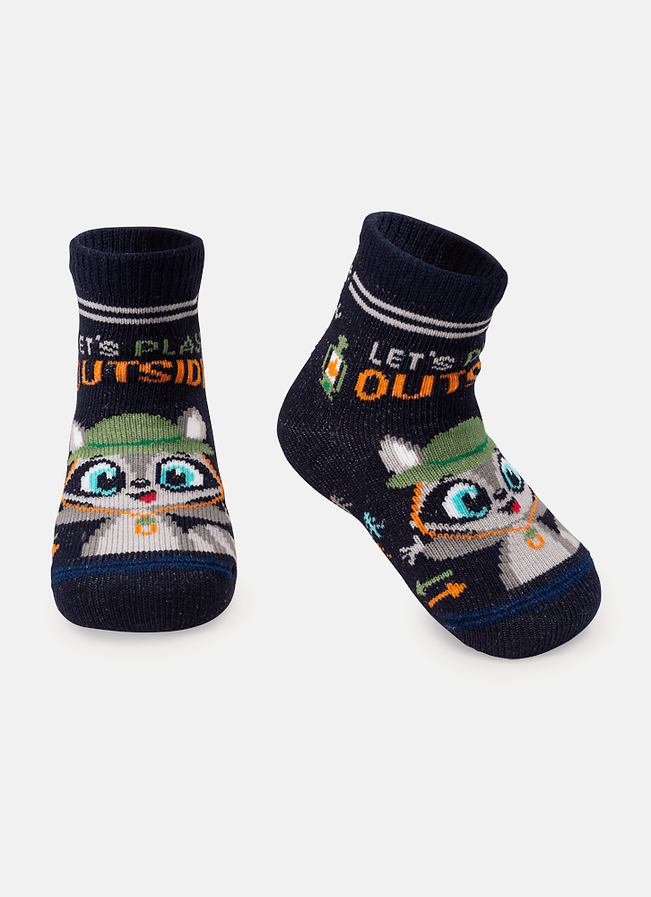 A meia soquete com desenho divertido do Guaxinim Possui cano de altura média. Produzida com algodão macio em sua maior parte em poliamida. Indicação de uso: Ideal para usar com calçados fechados. Instruções de Lavagem: Lavagem a mão Não alvejar Instruções de Conservação: Não secar em tambor Não passar Não limpar a seco (MAIS INFORMAÇÕES, VIDE NA ETIQUETA) Instruções de Garantia: Deverá ser encaminhado dentro na embalagem original ACOMPANHADO DE NOTA FISCAL E com todos os itens constante na solicitação da compra.