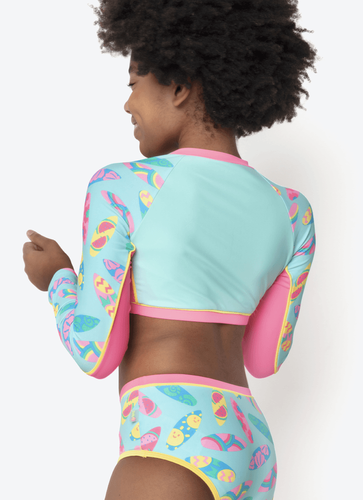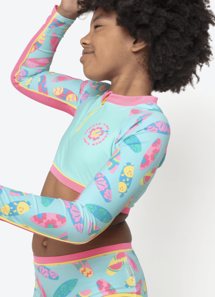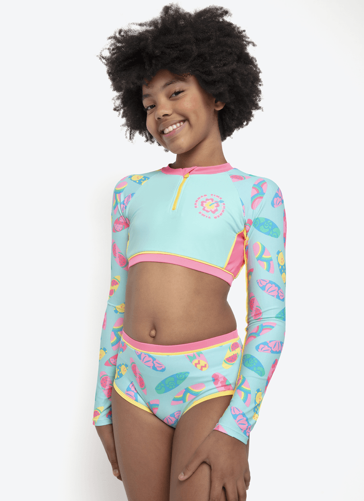 Descrição: conjunto teen. Possui manga longa raglan, abertura frotal em zíper, calcinha com estampa corrida e recortes com blocos de cor contrastantes. Nome do Produto: Conjunto cropped teen uni aloha. Modelagem: manga longa raglan. Tecido externo: 85% poliéster e 15% elastano Tecido interno: 90% poliamida e 10% elastano. Ocasião de uso: Ideal para usar em clubes, academias, piscinas, praia. Grade: teen - 10 /12 /14 /16 Diferencial do produto: tecido com toque macio, altamente resistente ao cloro; proteção solar UV (não substitui o uso de filtro solar); conforto. Como lavar e conservar bem meu produto: Lavagem à mão, temperatura máxima de 40c; não alvejar / não branquear; não secar em tambor; secagem em varal; não passar; não limpar a seco, não remover manchas com solventes; não guarde a peça úmida ; não use amaciantes ou produtos com alvejantes a base de cloro; evite contato com superfícies ásperas ; cloro e bronzeadores podem manchar o produto; após o uso, enxague bem a peça com agua fria; a contínua exposição à luz forte e água clorada pode deteriorar alguns tipos de tecidos e cores. Garantia por defeito: Deverá ser encaminhado dentro da embalagem original; Sem indícios de uso; acompanhado de nota fiscal e com todos os itens constantes na solicitação de troca.