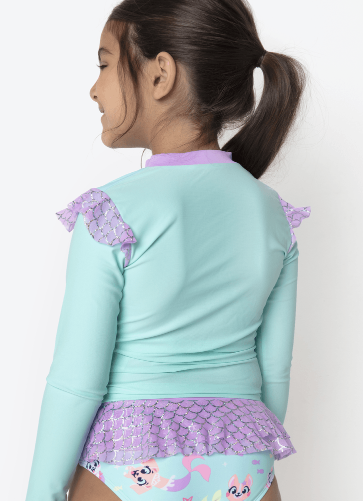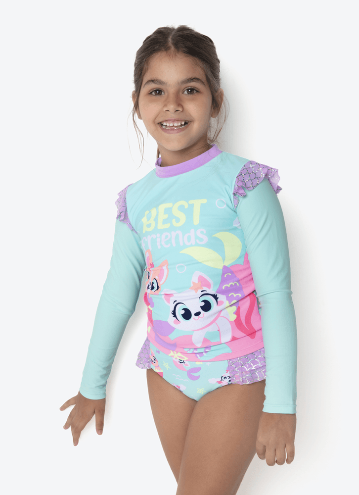 Descrição: Conjunto Camiseta Kids Sereia Pet. Possui estampa frontal toque zero. Ombros com aplique de babado em tule estampado com foil e calcinha com estampa corrida e detalhe de babado em tule na lateral. Nome do Produto: Conjunto praia kids Sereia Pet. Estampa camiseta: estampa frontal toque zero; Estampa calcinha: estampa corrida rotativa; Tecido externo: 85% poliéster e 15% elastano. Tecido interno: 90% poliamida e 10% elastano. Diferencial: tule macio com foil Ocasião de uso: Ideal para usar em clubes, academias, piscinas, praia. Grade: 1 / 2 / 4 / 6 / 8 - kids Diferencial do produto: estampa frontal toque zero, tecido com toque macio, altamente resistente ao cloro; proteção solar UV (não substitui o uso de filtro solar); conforto. Como lavar e conservar bem meu produto: Lavagem à mão, temperatura máxima de 40c; não alvejar / não branquear; não secar em tambor; secagem em varal; não passar; não limpar a seco, não remover manchas com solventes; não guarde a peça úmida ; não use amaciantes ou produtos com alvejantes a base de cloro; evite contato com superfícies ásperas ; cloro e bronzeadores podem manchar o produto; após o uso, enxague bem a peça com agua fria; a contínua exposição à luz forte e água clorada pode deteriorar alguns tipos de tecidos e cores. Garantia por defeito: Deverá ser encaminhado dentro da embalagem original; Sem indícios de uso; acompanhado de nota fiscal e com todos os itens constantes na solicitação de troca.