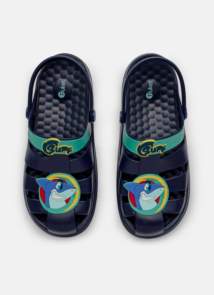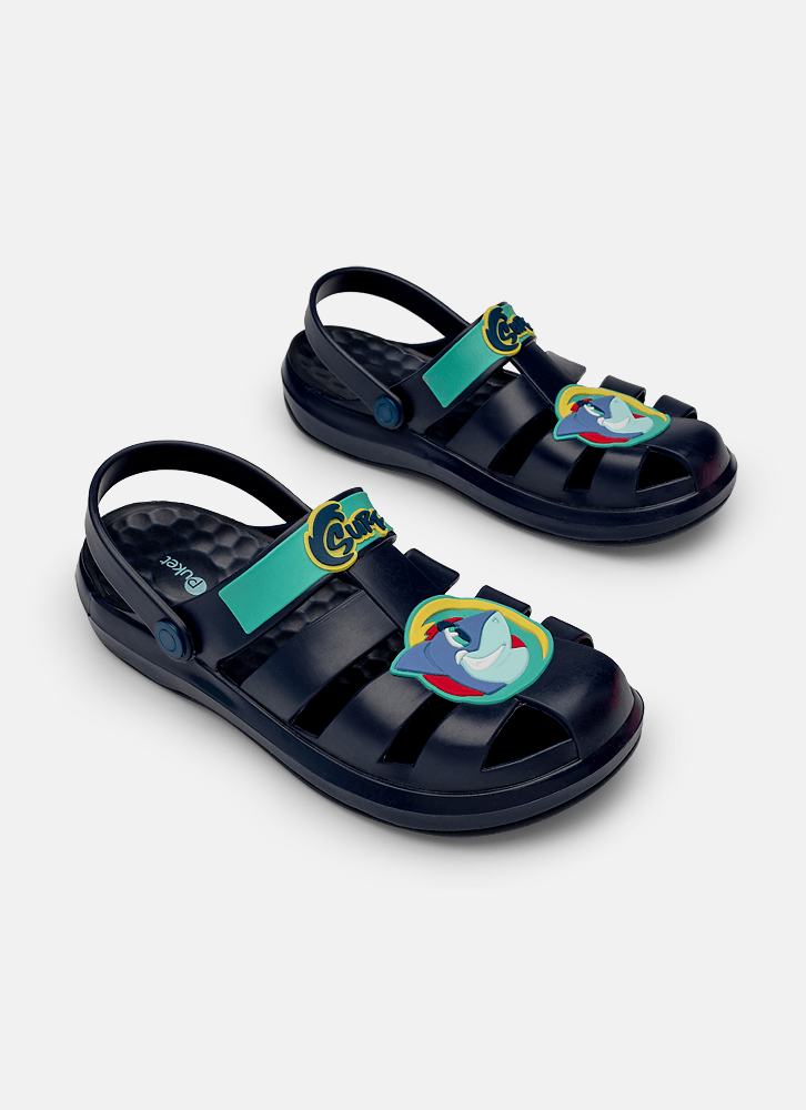 Sandália com tiras de PVC emborrachado. Possui alça móvel no calcanhar e detalhe de aplique de tubarão em PVC.