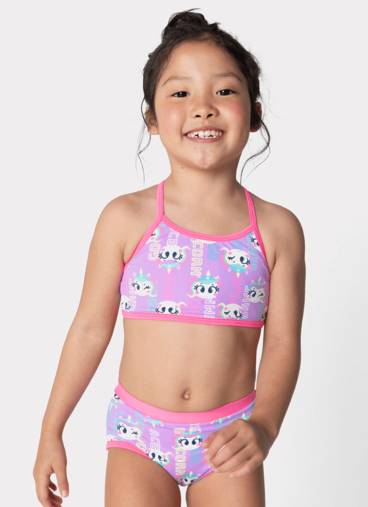 Biquíni kids. Possui estampa corrida e alças com cruzamento nas costas.