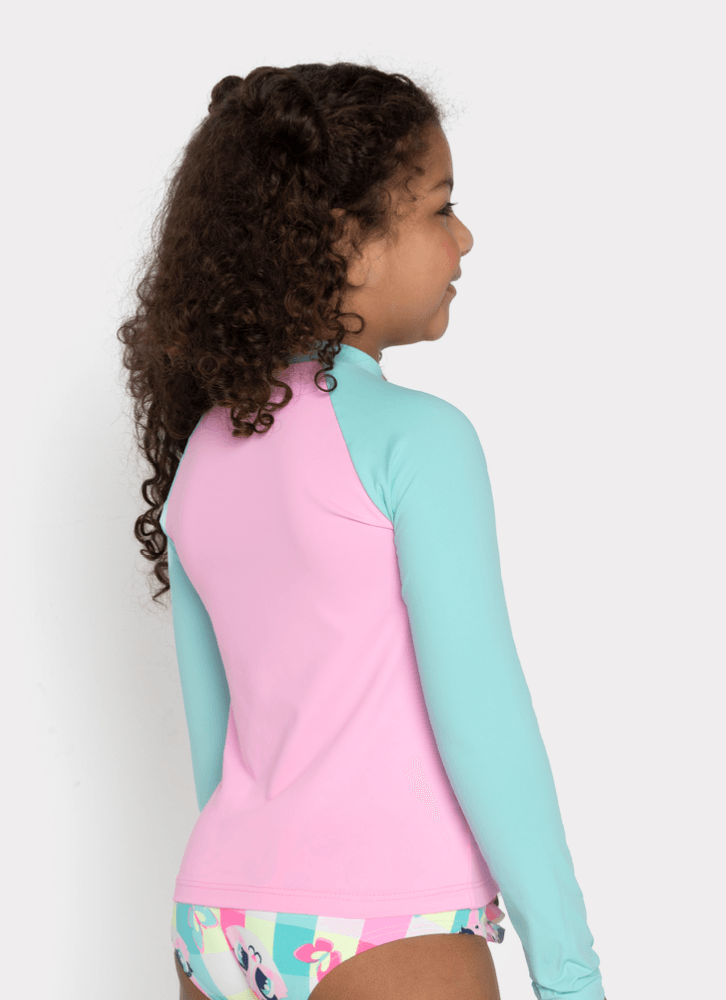 Conjunto camiseta kids. Possui estampa localizada em silk e manga longa raglan. Calcinha em estampa corrida com aplique de babado.