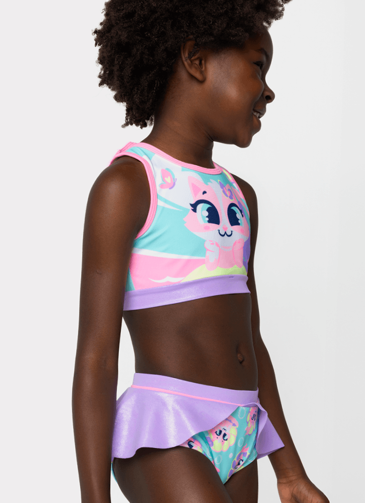 Biquini kids Gata Sereia. Possui top com ajuste duplo nas costas e estampa frontal toque zero. Faixa do top e aplique de babado na calcinha com cobertura de foil holográfico.