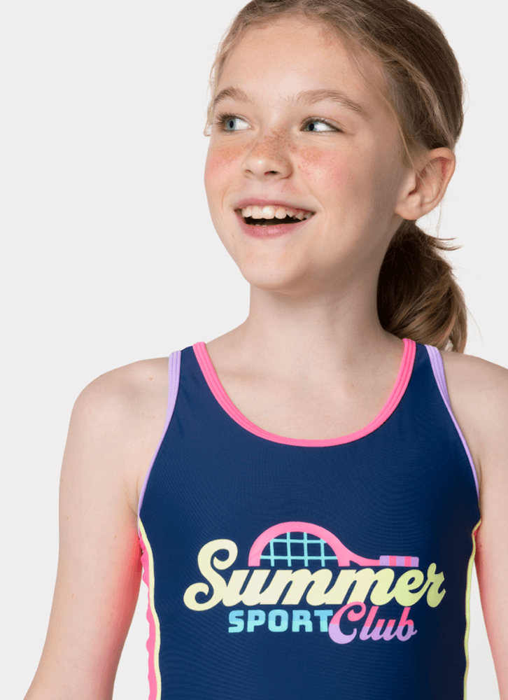 Maiô teen Uni Tênis. Possui estampa em silk e recortes multicoloridos na lateral