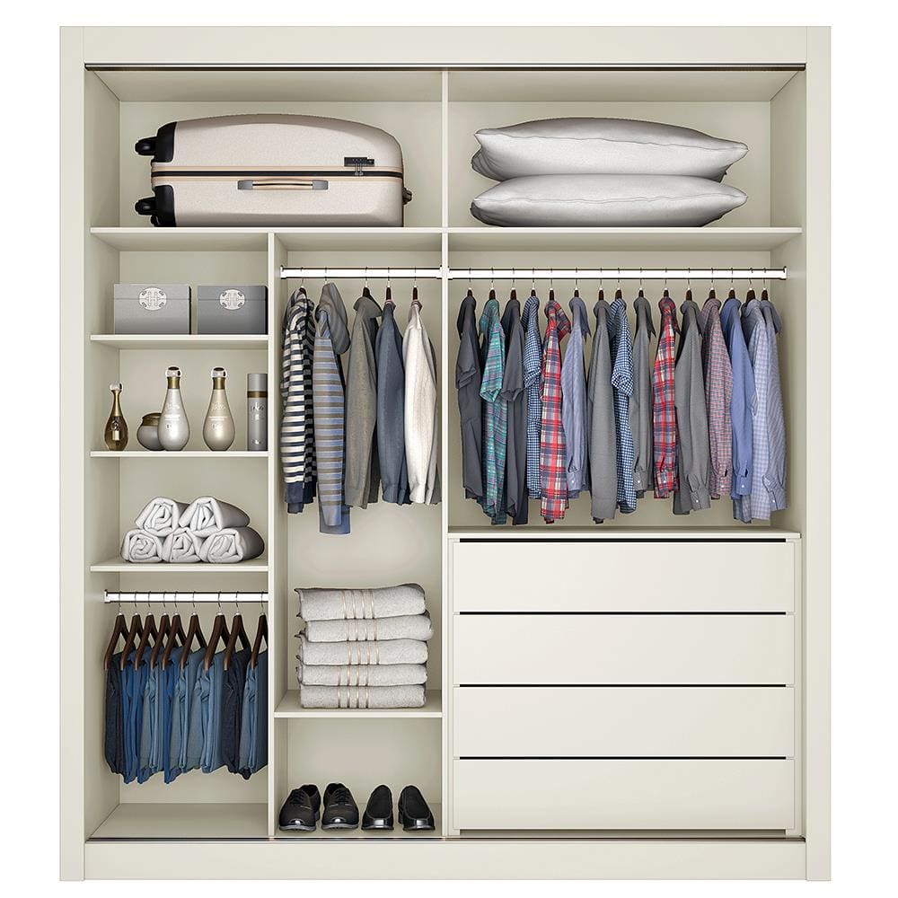 Ele tem 4 gavetas com corrediças telescópicas, 6 prateleiras, 2 cabideiros e 1 calceiro em alumínio. Possui também modulação para roupas longas e prateleiras removíveis. Seu espaço interno é muito bem dividido, perfeito para organizar as suas roupas e acessórios.