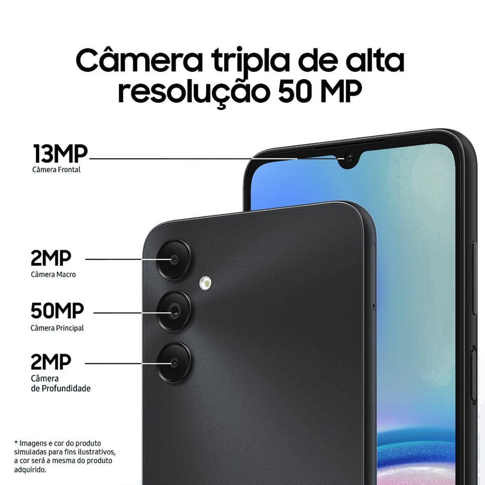 Conteúdo da Embalagem: -1 Smartphone Samsung Galaxy A05s Preto 128GB, 6GB, Tela Infinita de 6.7", Processador Octa-Core, Câmera Tripla Traseira e Selfie de 13MP;