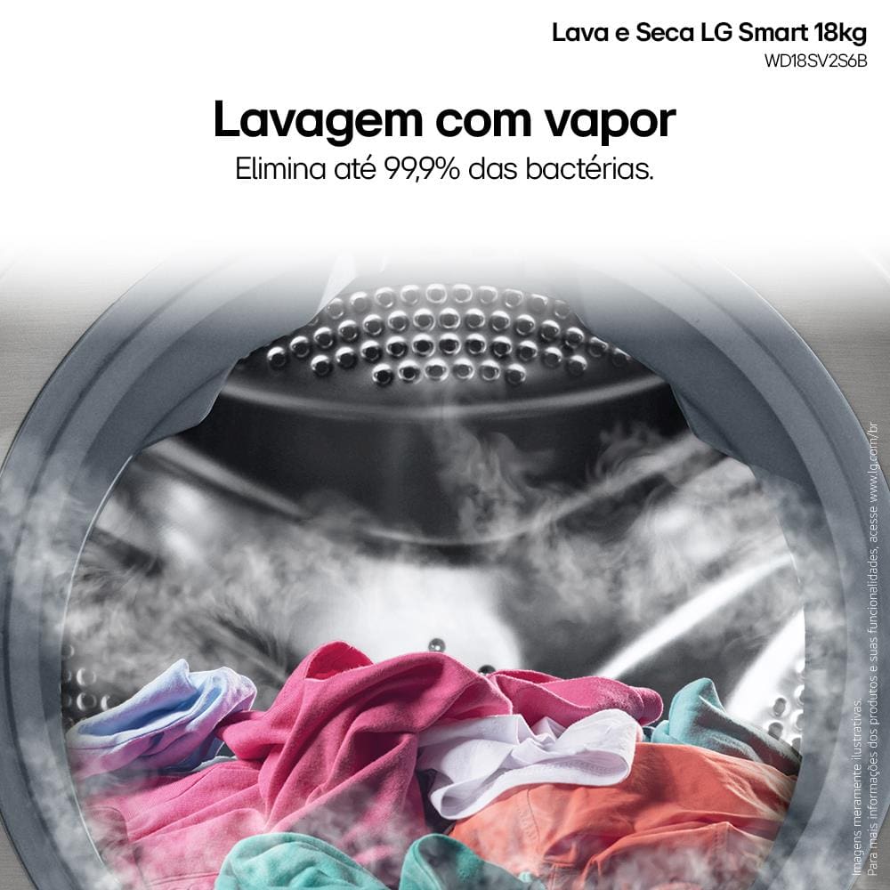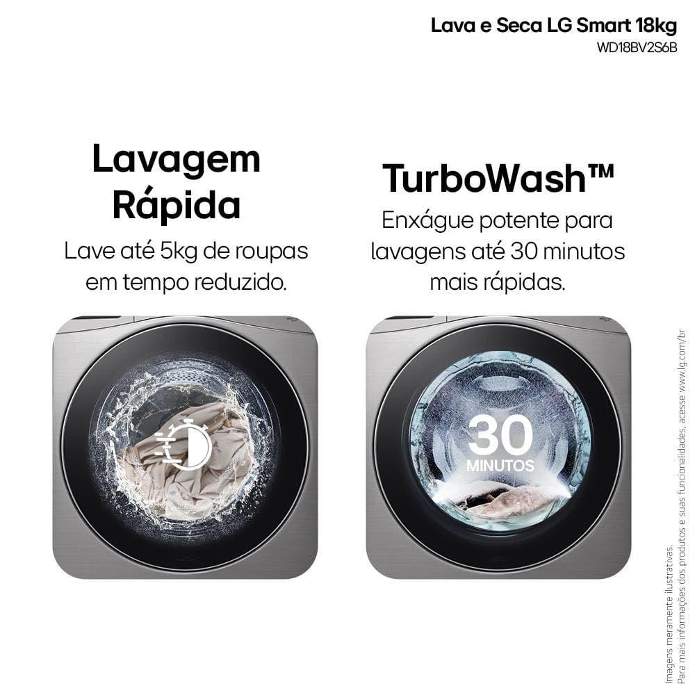 Conteúdo da embalagem: -Lava e Seca LG 18Kg/10Kg com Inteligência Artificial AI DD™ e Wi-Fi WD18SV2S6B – Inox Look;