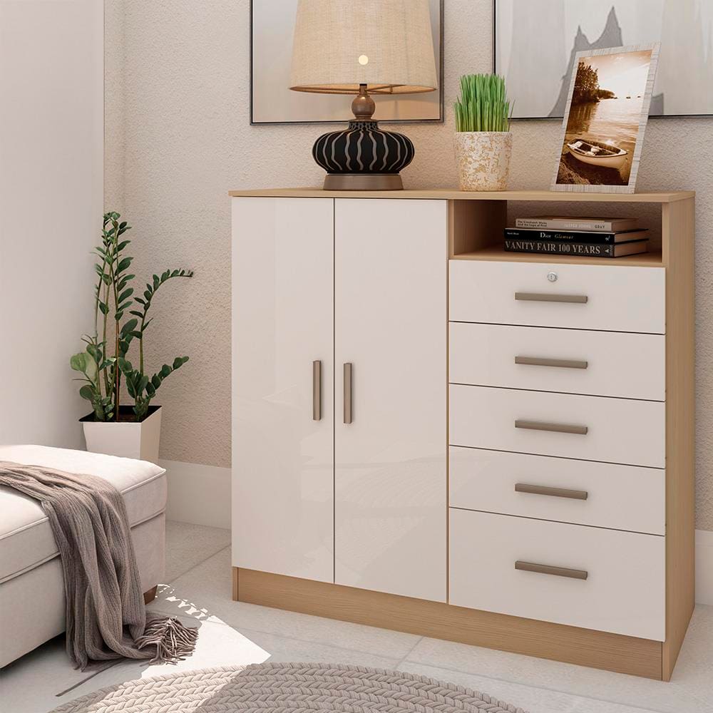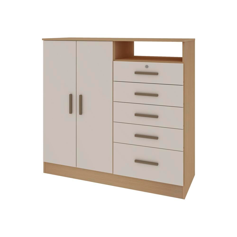 Transforme seu ambiente com a Cômoda Genialflex Guatemala, um móvel que combina um design moderno com a máxima funcionalidade. Com 5 gavetas, 2 portas e 2 prateleiras, oferece amplo espaço para organização, tornando seu quarto mais prático e elegante. A gaveta com chave proporciona mais segurança, ideal para itens valiosos ou pessoais.