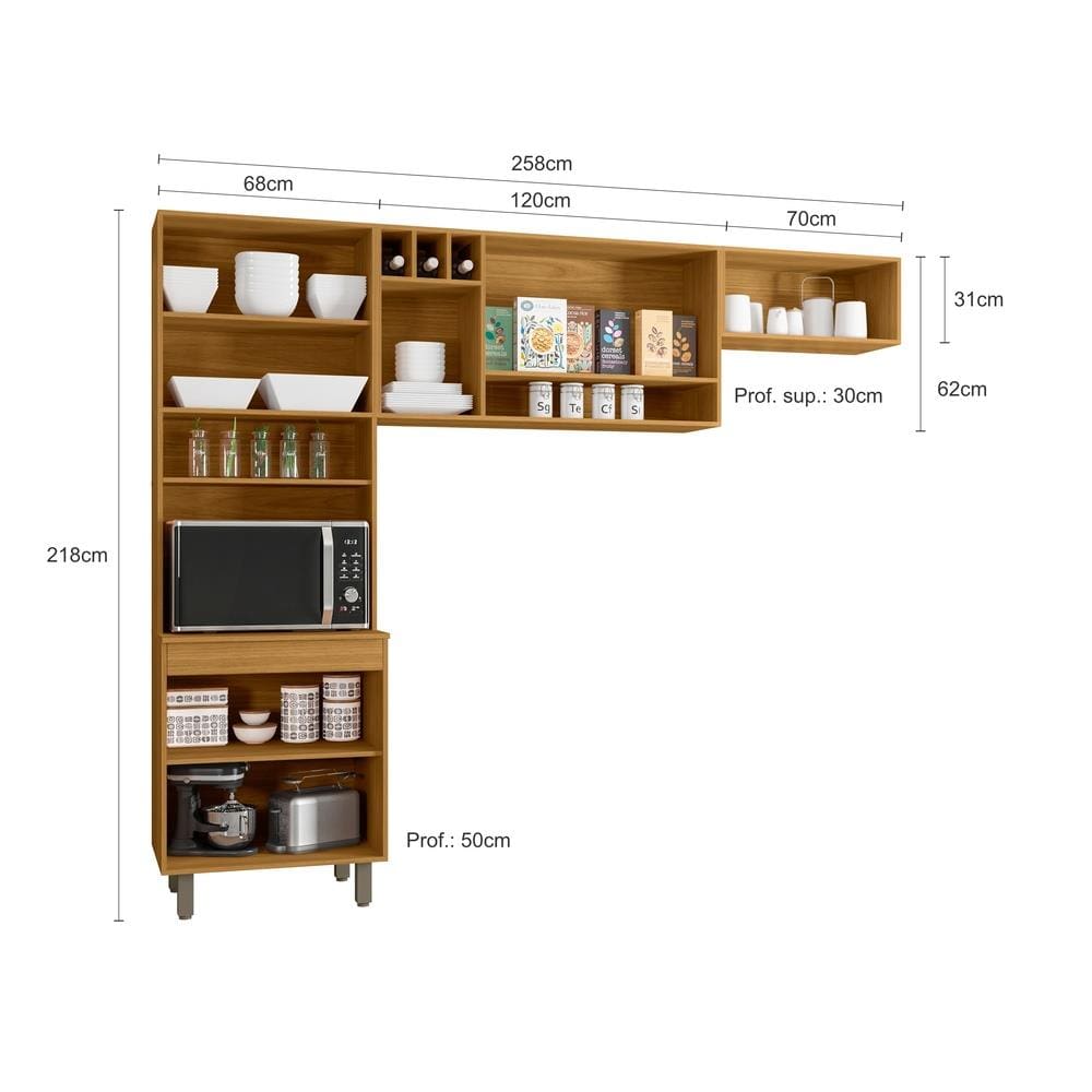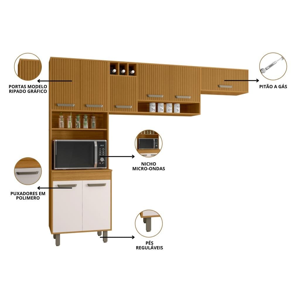 O paneleiro duplo de altura diferenciada (218 cm) possui 4 portas de bater com dobradiças metálicas de 26mm, prateleiras internas e nicho para micro-ondas (A: 42 x L: 65 x P: 50 cm), perfeito para o dia a dia. O aéreo de 120cm inclui 3 portas, nicho decorativo (A: 23,5 x L: 65 x P: 18 cm) e adega para 3 garrafas, combinando charme e utilidade.