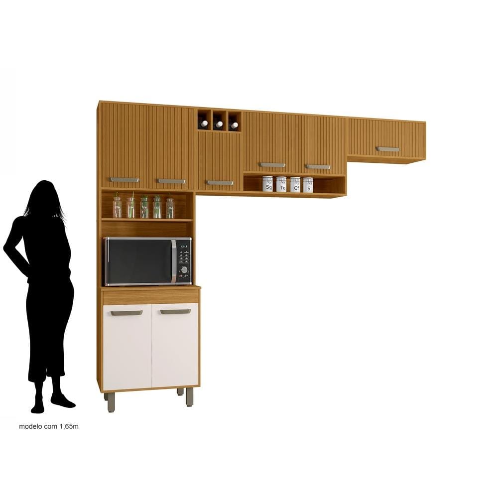 Características Gerais: - Modelo: Cozinha Compacta Malta - Composição: 3 módulos (paneleiro duplo, aéreo duplo, aéreo geladeira) - 7 portas de bater - 1 porta basculante com pistão a gás - 2 prateleiras fixas (suportam até 2kg cada) - 4 puxadores em polímero bronze - Adega para 3 garrafas - Nicho decorativo e nicho para micro-ondas (A: 42 x L: 65 x P: 50 cm) - 4 pés em PVC, pirâmide, reguláveis de 17cm (cor bronze) - Material: MDP 15mm / HDF 3mm - Acabamento: Pintura UV freijó/off white acetinado com detalhes ripados - Fixação: Parafusos, pregos, cavilhas - Suporta até 37 kg - Peso: 77,400 kg - Dimensões montado (AxLxP): 218 x 258 x 30 cm(Superior) / 50 cm(Inferior)