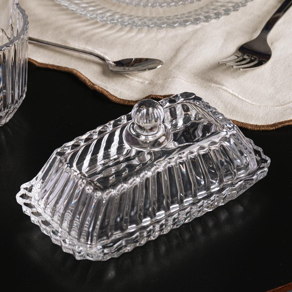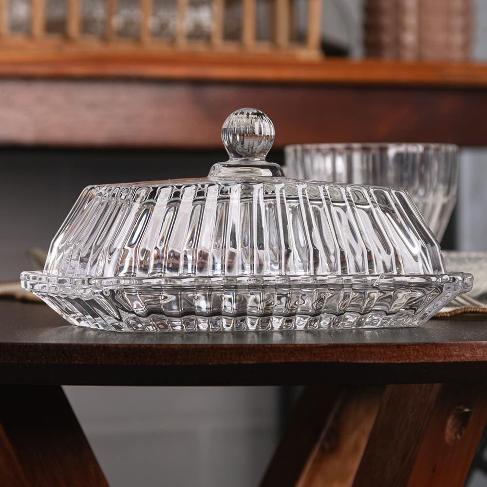 Seu design retangular com cristal transparente de alta qualidade proporciona uma apresentação luxuosa, valorizando o conteúdo e o ambiente à sua volta.A tampa Império traz um toque decorativo e funcional, mantendo a manteiga protegida e fresca, além de facilitar o acesso com sua fácil remoção.