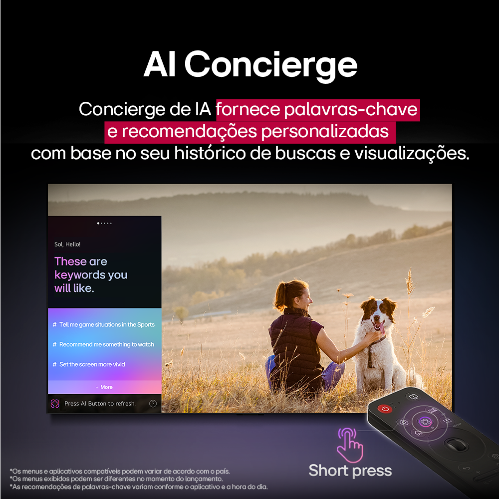 Com o novo sistema WebOS 25 e o exclusivo controle Smart Magic MR25, você tem acesso facilitado a aplicativos como Netflix, Disney+, Amazon Prime Video e Max. O novo botão de IA, comandos de voz e recursos de arrastar e soltar tornam a navegação ainda mais intuitiva e personalizada.