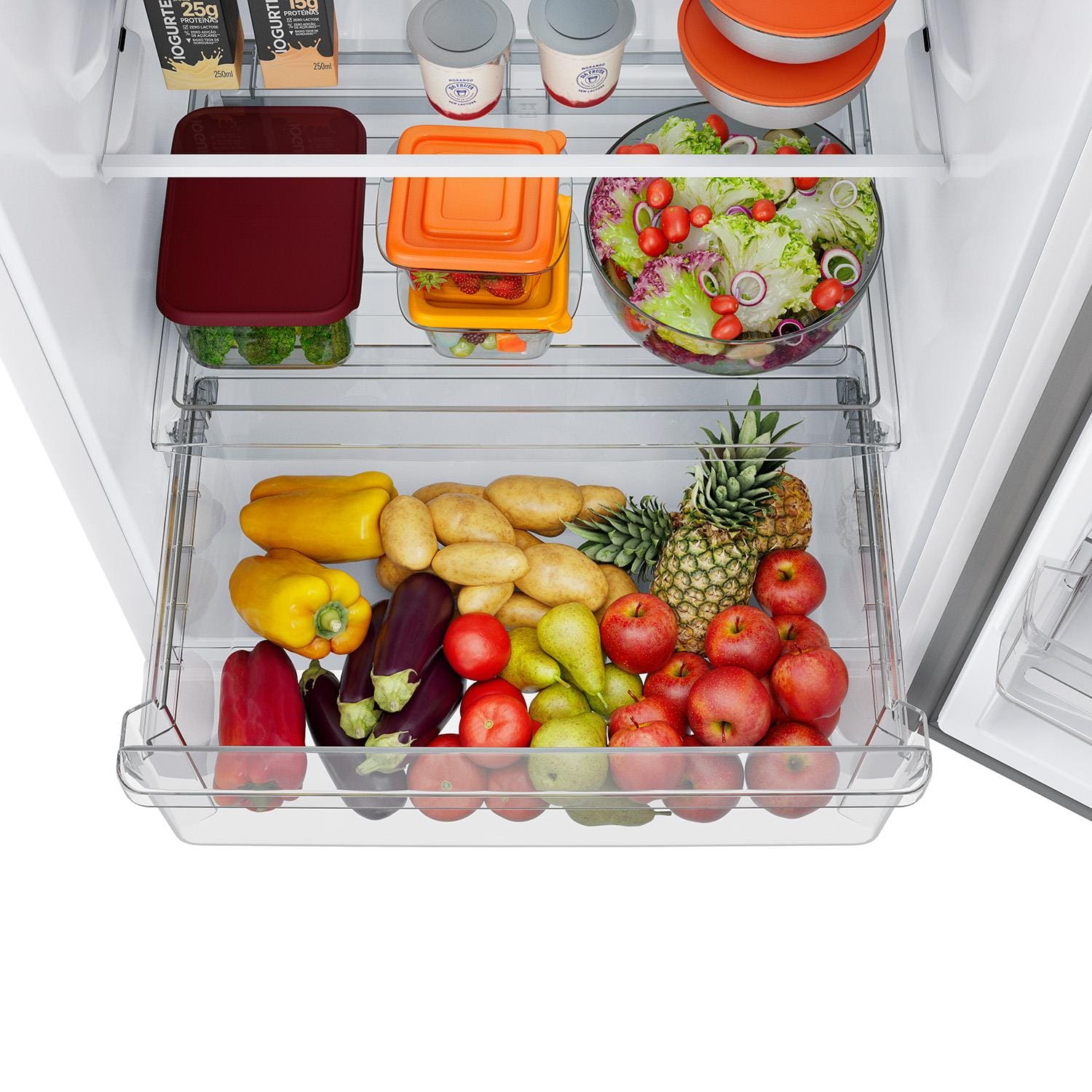 As prateleiras ajustáveis e a gaveta para legumes proporcionam espaço interno versátil, enquanto o compartimento extra frio conserva alimentos delicados por mais tempo.