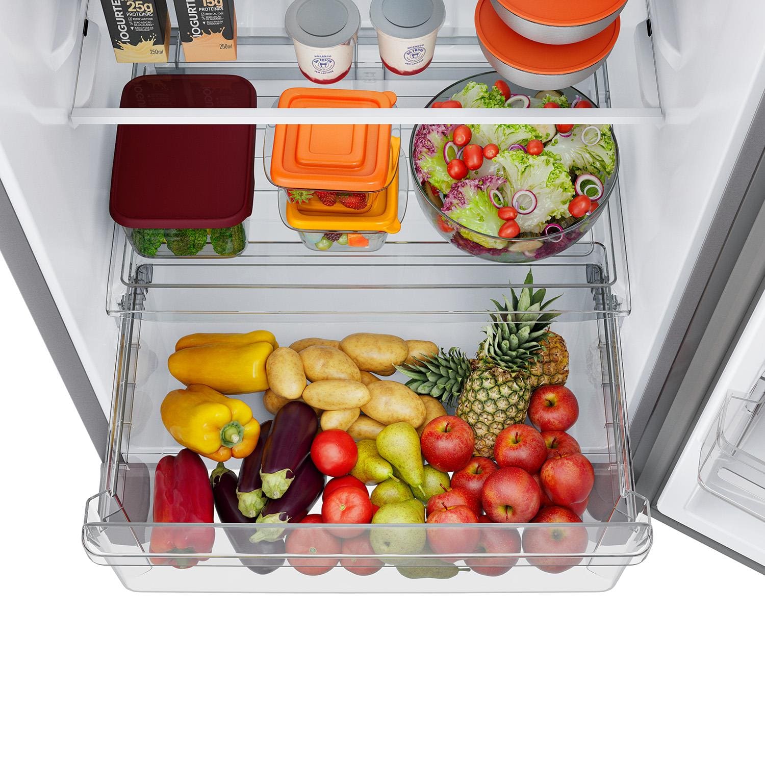 As prateleiras ajustáveis e a gaveta para legumes proporcionam espaço interno versátil, enquanto o compartimento extra frio conserva alimentos delicados por mais tempo.