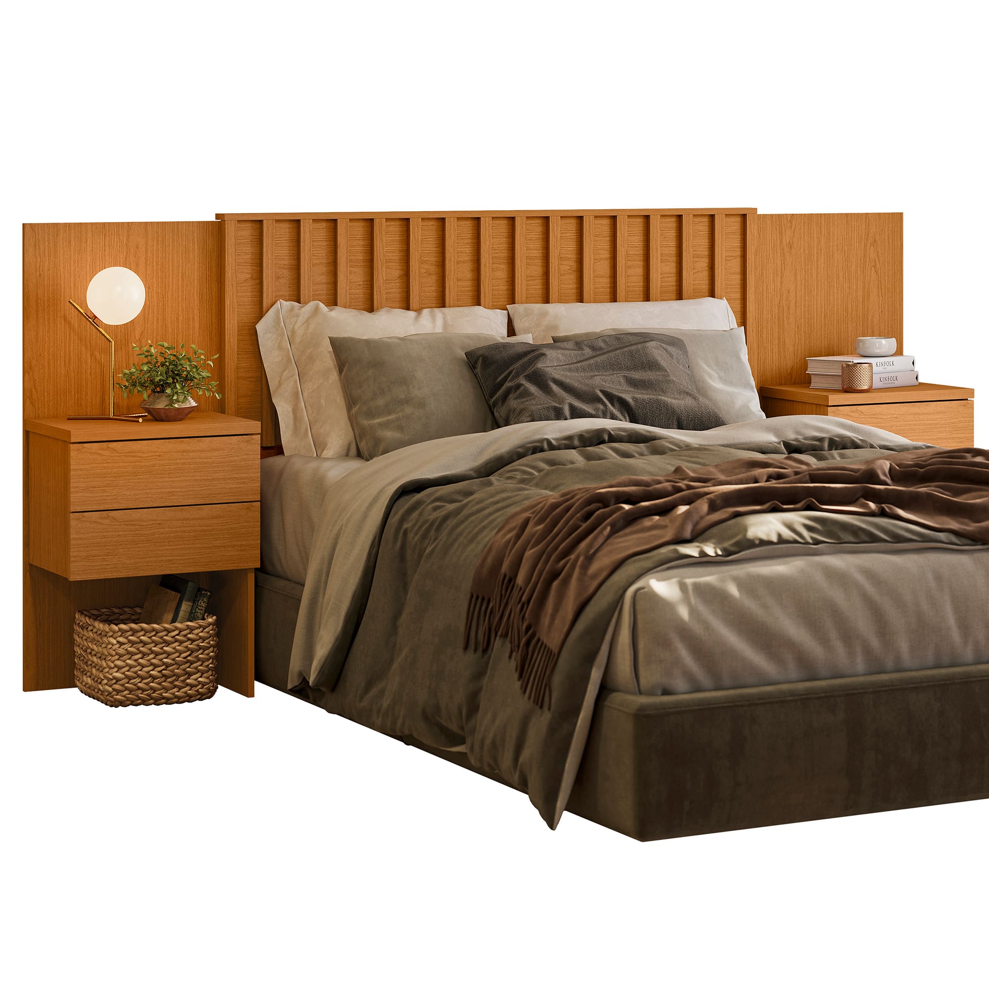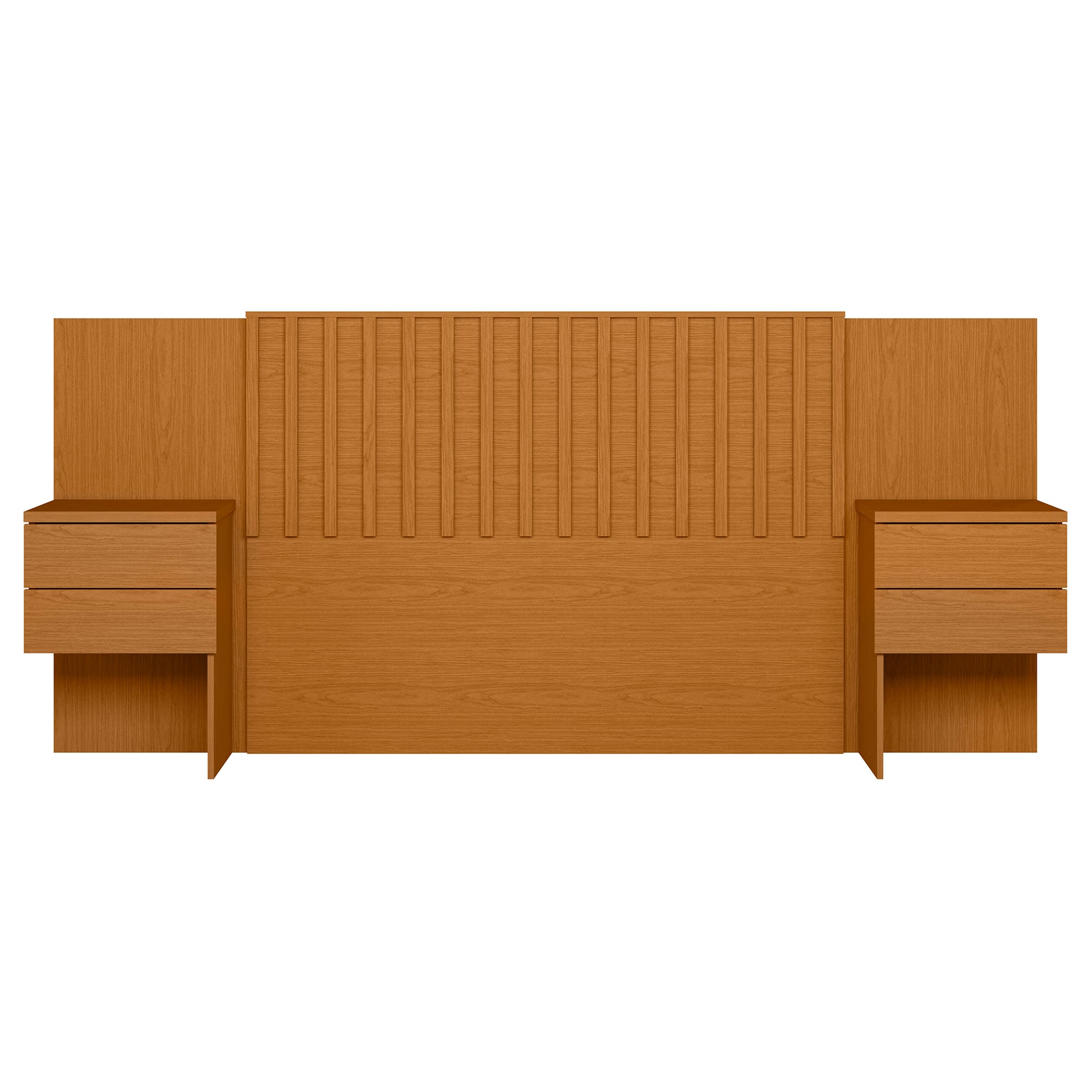 - Cabeceira: Extensível para cama de casal e queen, com prateleiras e gavetas