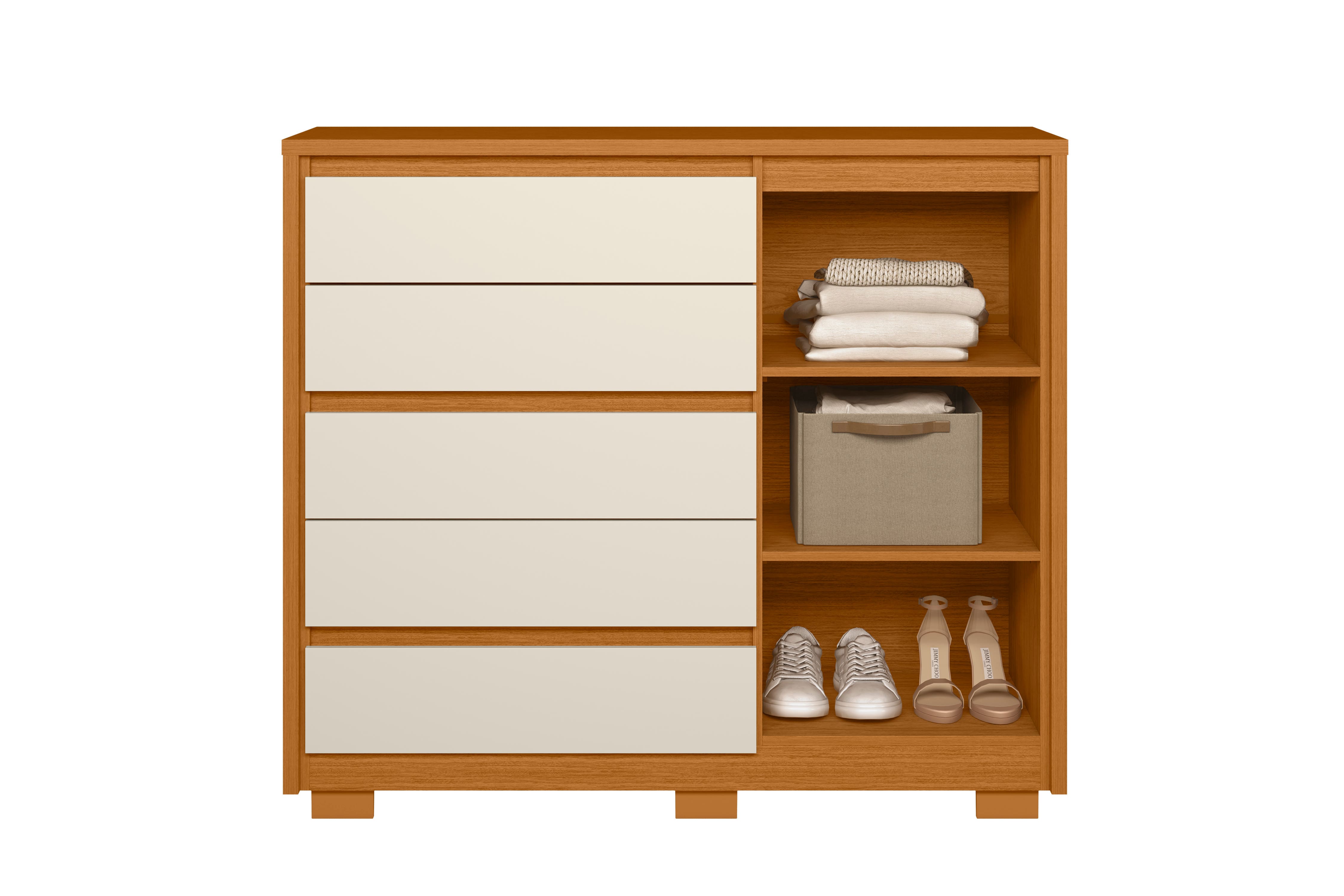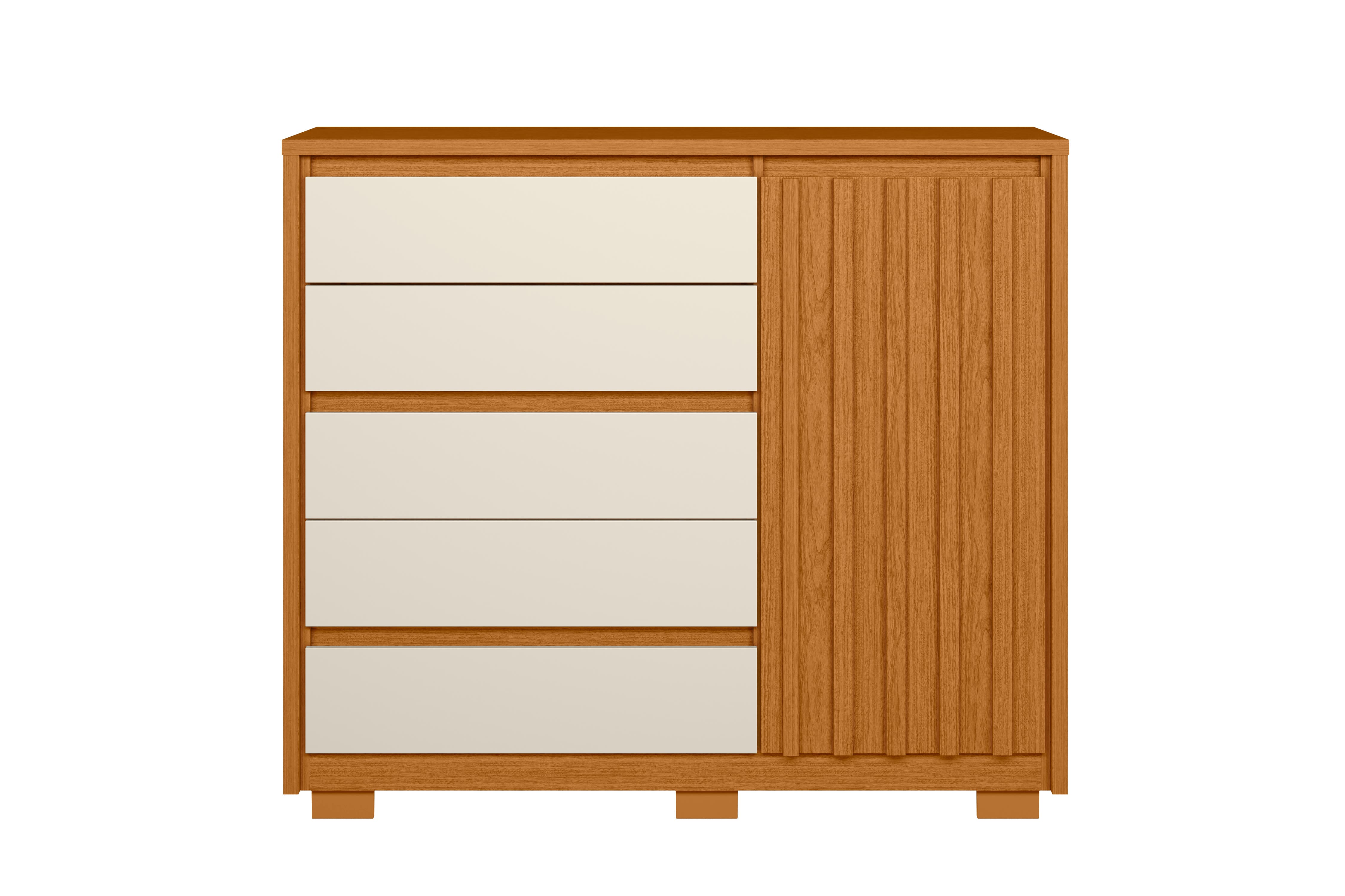 - Cômoda: 5 gavetas com corrediças telescópicas, 1 porta ripada