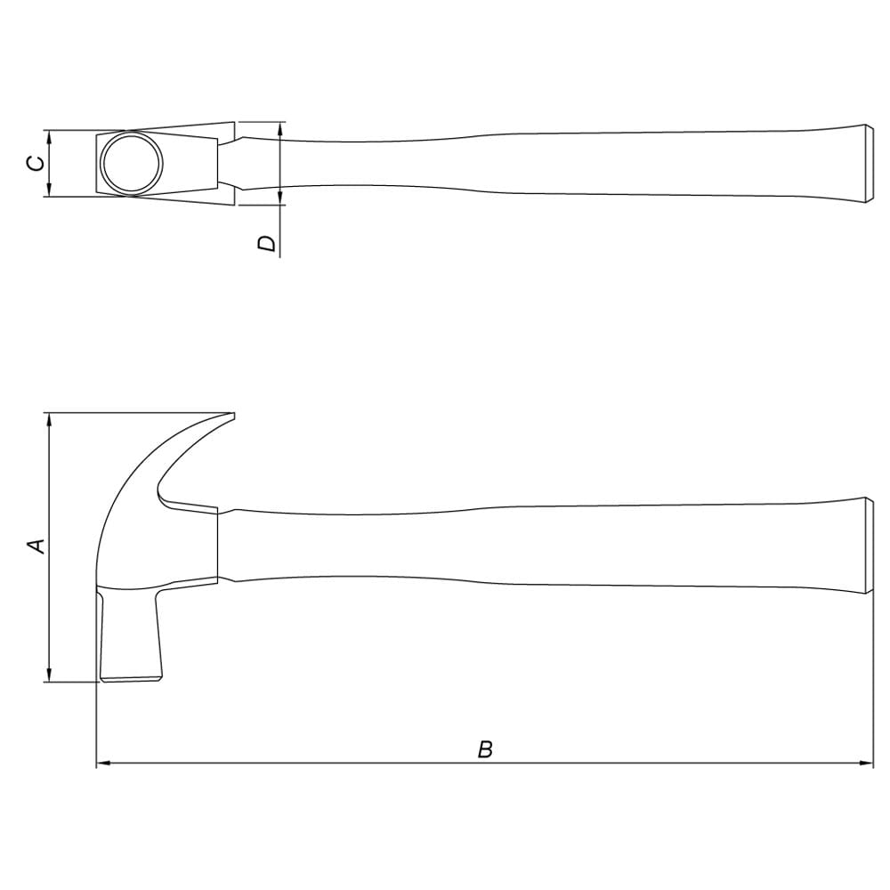 Características Gerais: • Cabeça forjada e temperada em aço especial • Perfeito balanceamento entre cabeça e cabo • Cabeça protegida contra oxidação com verniz • Cabo em madeira envernizada • Acabamento polido e envernizado • Sistema de fixação da cabeça ao cabo por resina epóxi • Martelo submetido a um processo localizado de têmpera para se obter uma dureza adequada na base de impacto e unha/pena que suporte o uso contínuo por longo períodos Medidas (Croqui) Dimensão Extra A: 112,0 mm Dimensão Extra B: 323,0 mm Dimensão Extra C: 25,0 mm Dimensão Extra D: 33,0 mm