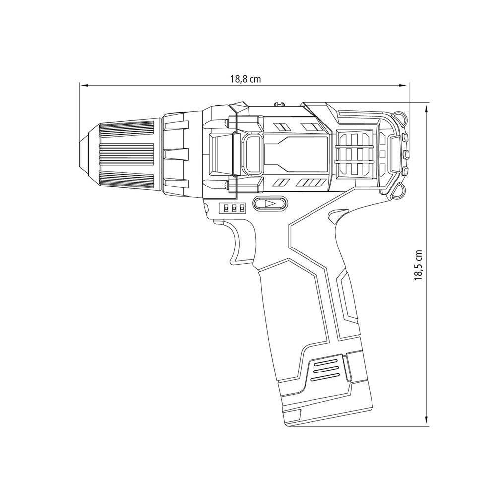 Características Gerais: • Parafusadeira e Furadeira (2 em 1) • Motor com 2 velocidades variáveis e reversíveis • Aplicação em plástico, madeira e metal (aço) • LED frontal para iluminação da área de trabalho • LEDs laterais para indicação do nível da bateria • Mandril 3/8" - 10mm com sistema de aperto rápido que dispensa a utilização de chaves • Travamento do gatilho • Velocidade (rpm/ min-1): 0-350/0-1300 • Torque máx. pesado/leve (N.m.): 0-25/0-15 • Posições de torque: 19 + 1 (furação) • Capacidade de perfuração em aço (mm): 10 • Capacidade de perfuração em madeira (mm): 21 • Bateria (2 x 10,8 V): Li-ion – 1500 mAh • Carregador: Bivolt (100-240 V c.a.) • Corpo e botões injetados • Empunhadura ergonômica e emborrachada • Torque elevado para parafusamentos e alta velocidade para perfurações • Interruptor com velocidade variável e reversível • Acompanha manual de instruções • As ferramentas são produzidas e testadas conforme normas específicas • Peso da parafusadeira: 1,1 Kg • Peso com maleta e acessórios: 2,84 Kg • Medidas: 18,5 x 18,8 cm (AxC)