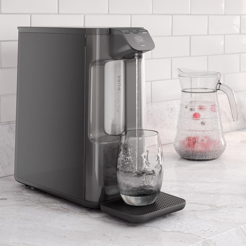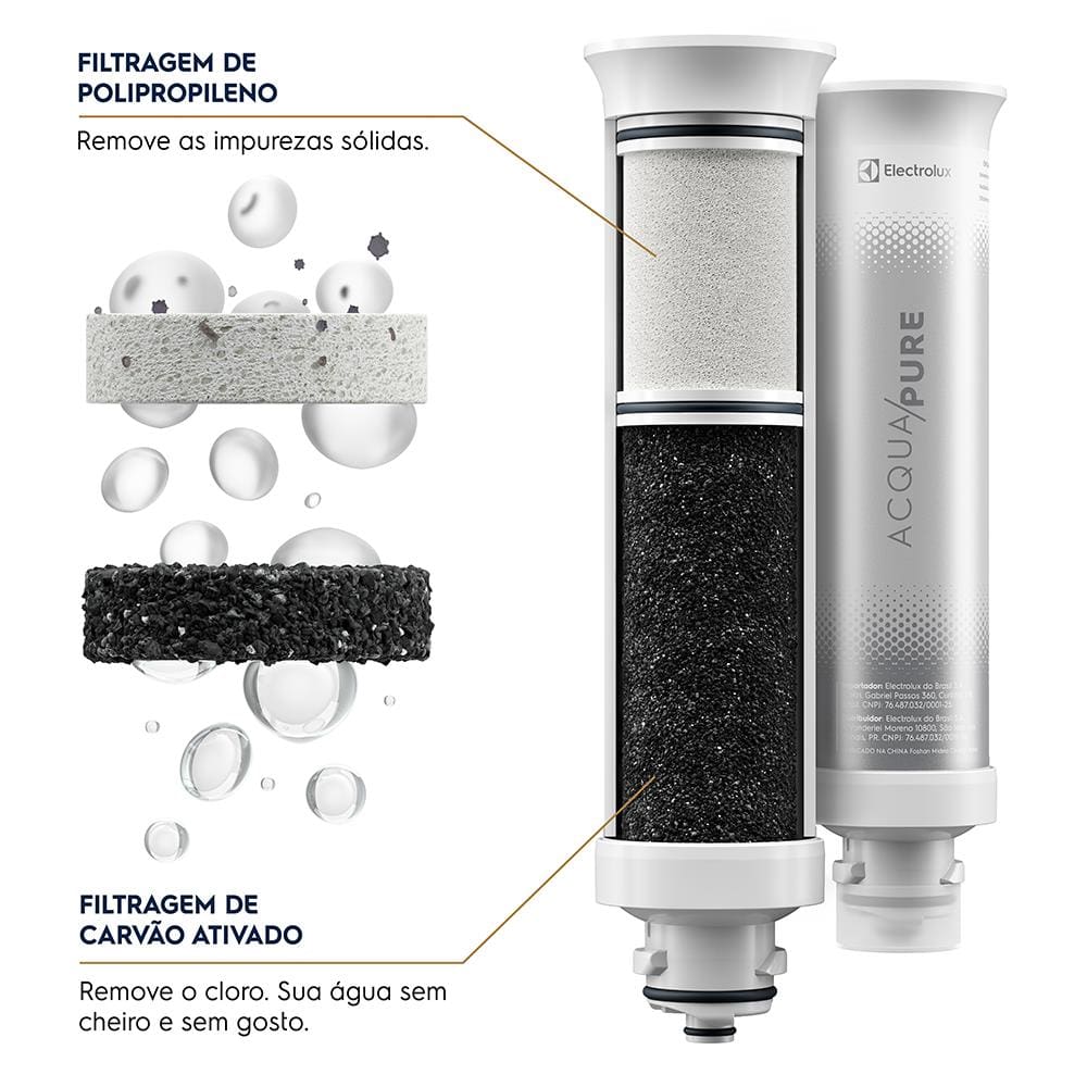 O filtro com Tecnologia Acqua Pure reduz cloro, odores e partículas, além de inibir bactérias, garantindo uma água pura, saudável e segura para toda a família.