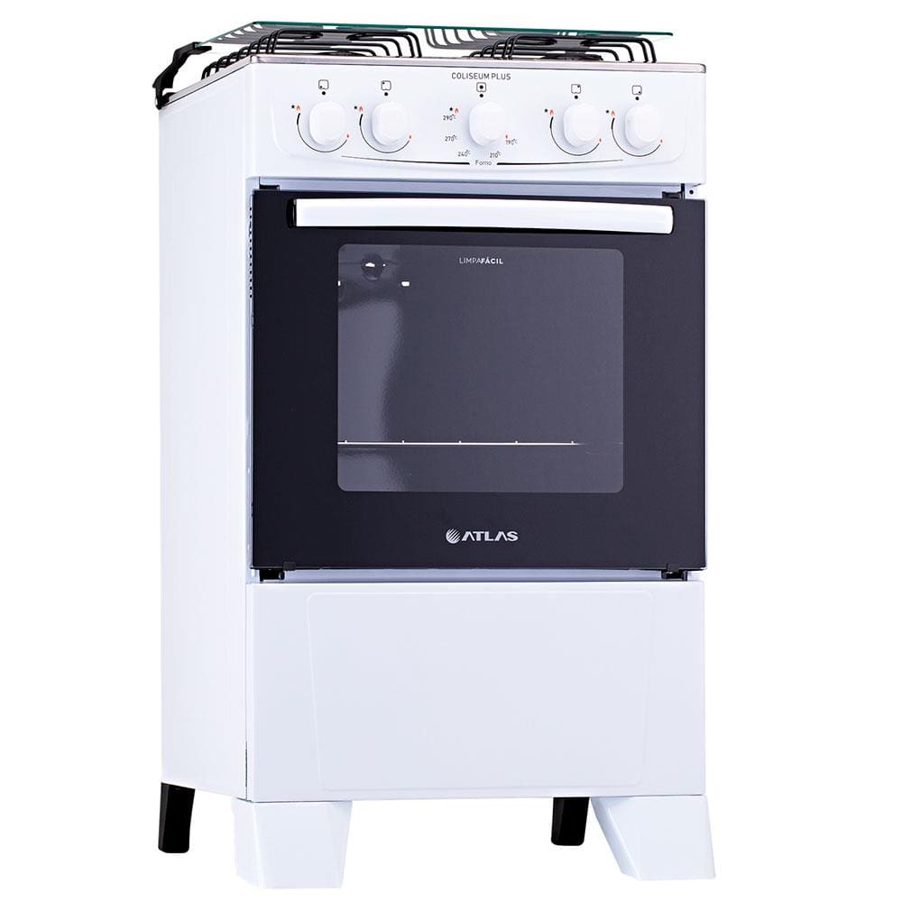 Conteúdo da embalagem: - 1 Fogão Atlas 4 Bocas Coliseum Plus com Mesa de Inox, Forno com Amplo Visor e Acendimento Manual – Branco;