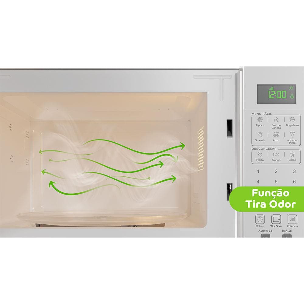 Características Gerais: - DESIGN MODERNO: Fácil de limpar e prático de usar. - MENU FÁCIL: Receitas práticas para o dia a dia - ESPAÇO DE SOBRA: O espaço perfeito para todo tipo de prato. - FUNÇÃO TIRA ODOR: Chega de micro-ondas com cheiro de comida! - MENU DESCONGELAR: Descongela os alimentos ao toque de um botão