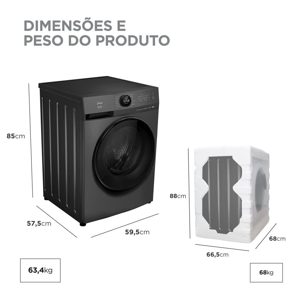 Conteúdo da embalagem: -1 Lava e Seca Midea Slim HealthGuard Smart MF201D110WB/GK Titanium