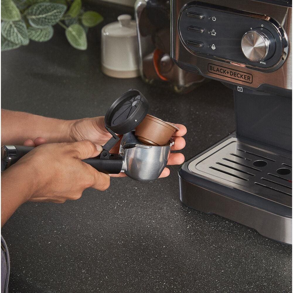 Aprecie um café espresso delicioso e aromático com a Cafeteira Espresso Black+Decker CE1100G Gourmand Gris. Além do design sofisticado em inox, esta cafeteira é multifunções, oferecendo a praticidade de preparar café em pó ou em cápsulas, compatível com os sistemas Nespresso® e Dolce Gusto®.