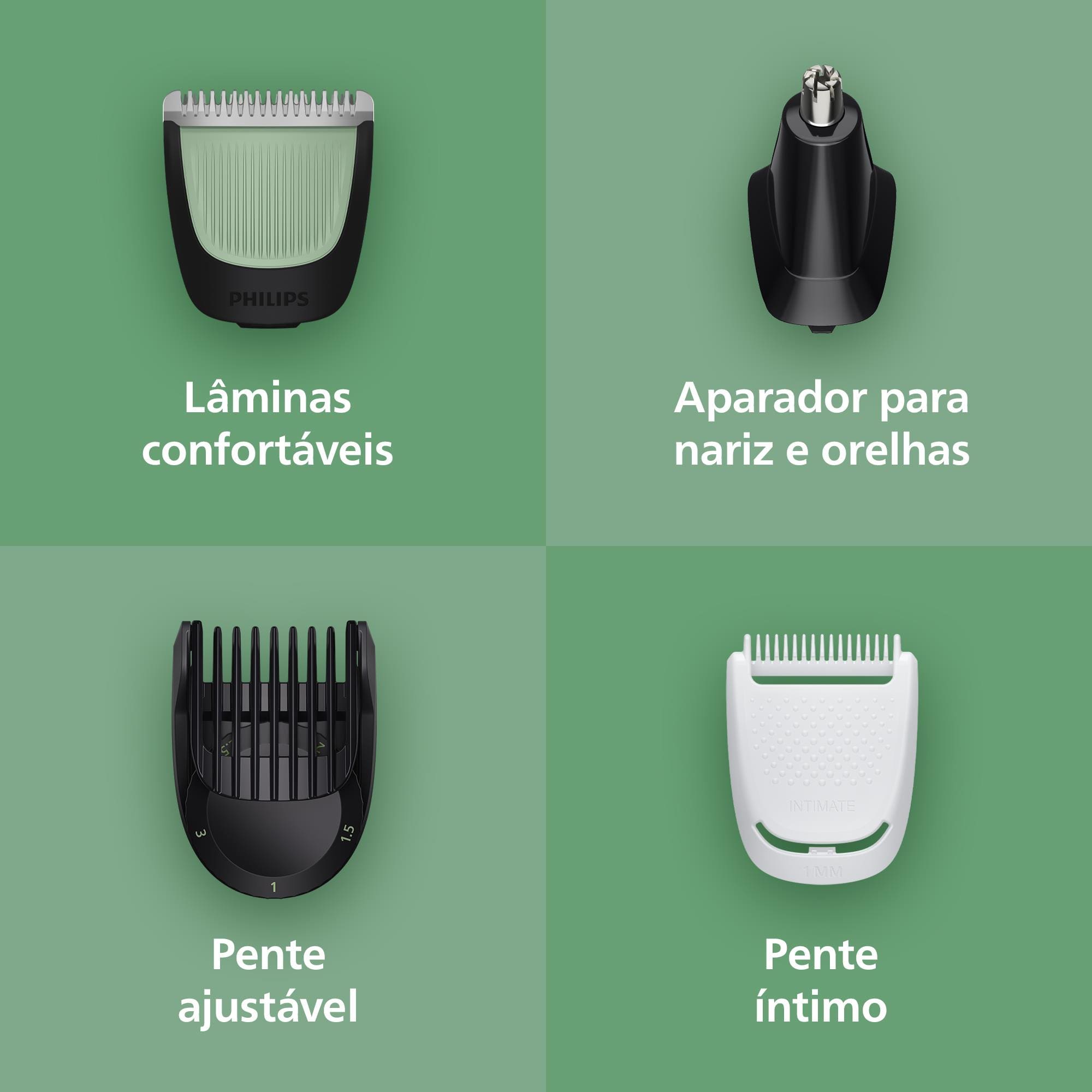 O kit inclui 10 acessórios para aparar barba, cabelo e pelos do corpo, além de aparador para nariz e orelhas. Os pentes variam de 0,5 mm a 16 mm, com ajustes de precisão para cada área do corpo, incluindo áreas íntimas.